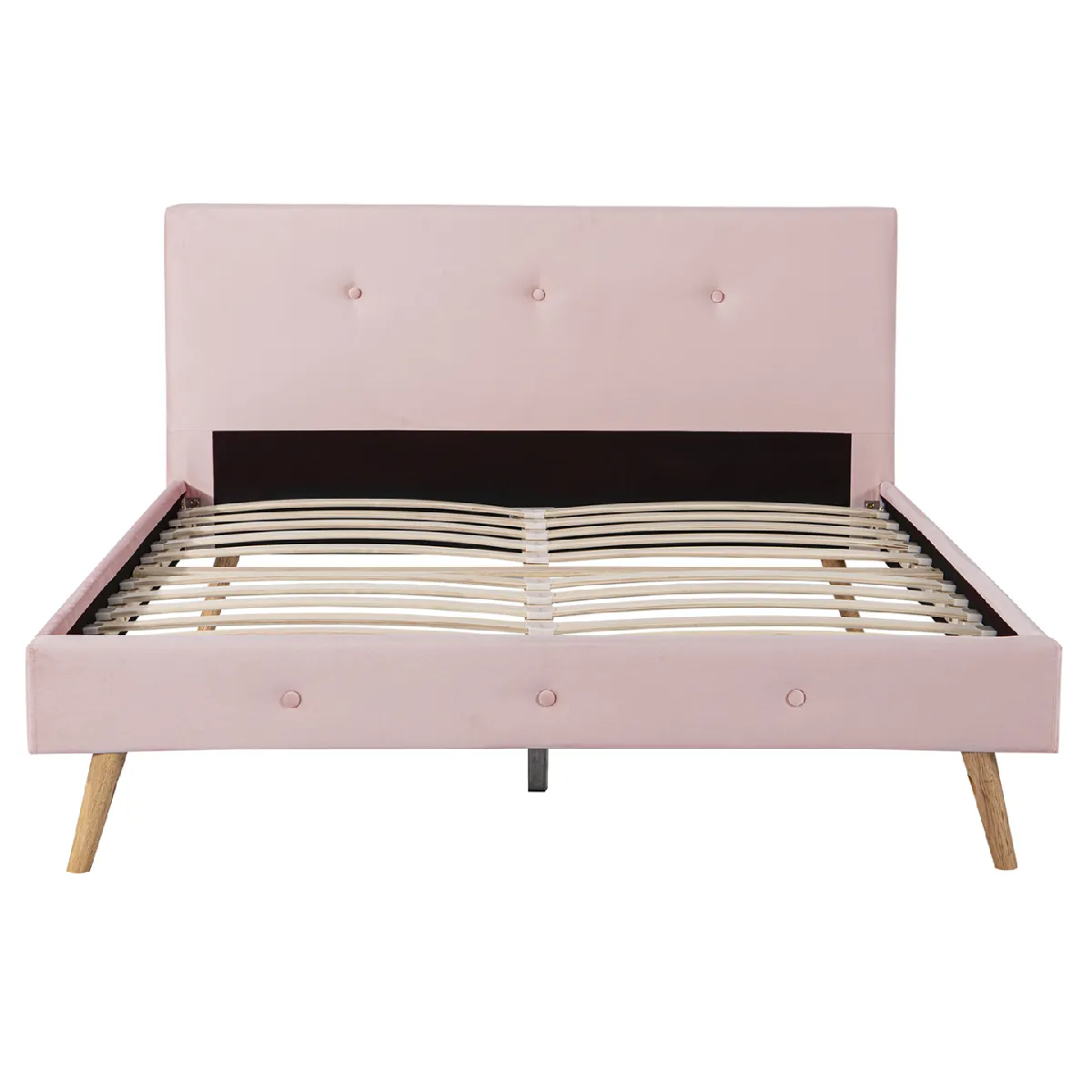 Lit Scandinave - Tissu rose clair effet velours - Sommier bois 24 lattes - Capitonnage chic