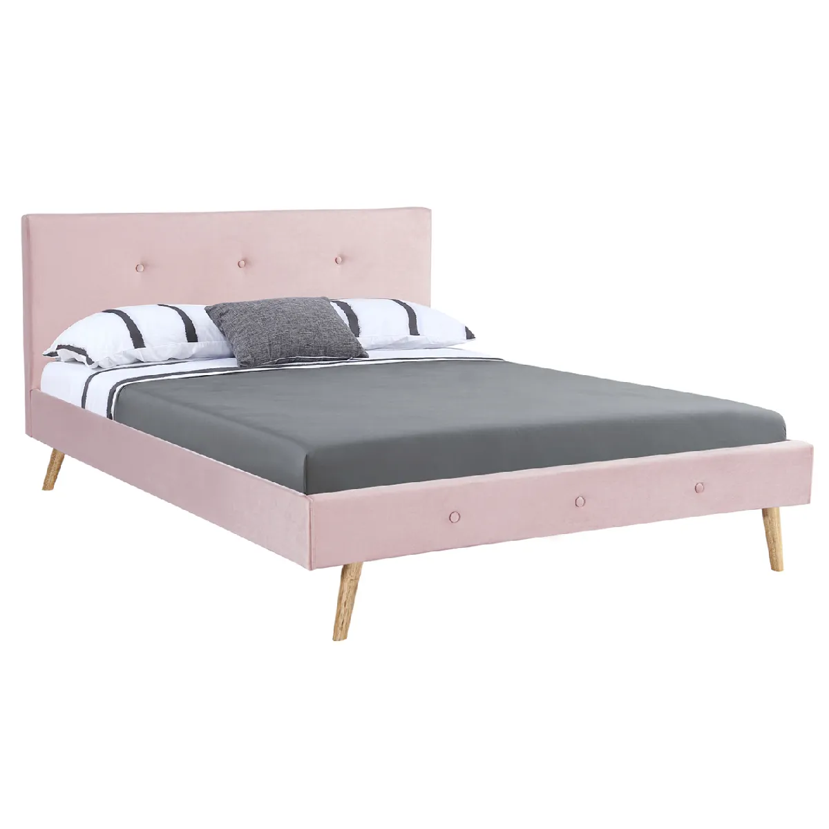 Descriptif du lit scandinave OSLO rose clair effet veloursEnvie de relooker votre chambre avec une touche nordique et chaleureuse ? Craquez pour ce lit double 140 x 190 CM rose clair effet velours ultra-confortable et créez une véritable ambiance cocooning.Le cadre de lit et la tête de lit sont dotés d'un joli capitonnage sur un tissu effet velours rose clair pour apporter harmonie et douceur à la décoration de votre pièce. Ses finitions soignées et ses 4 pieds fuseaux en bois (hauteur 18 CM) rendent l'ensemble encore plus chic et moderne. Pour des nuits reposantes et un sommeil réparateur, le lit OSLO propose un sommier en bois MDF à 24 lattes, dont la zone lombaire est renforcée grâce au resserrement des lattes. Aussi sa forme ergonomique facilite l'aération du matelas et apporte flexibilité au couchage. Pour encore plus de stabilité, la structure est renforcée par 3 pieds centraux de renfort en métal. Grâce à la densité de sa mousse de 240 gr/m3, c'est le confort garanti ! Que ce soit pour votre chambre à coucher ou pour une chambre d'amis, faites de beaux rêves dans ce lit scandinave OSLO rose clair avec son effet velours irrésistible pour une ambiance cocooning à prix mini ! Dimensions du lit scandinave OSLO rose clair effet velours- Dimensions standard pour un matelas 140 x 190 CM - Dimensions hors tout : Longueur 204 CM x largeur 147 CM x Hauteur 88 CM environ- Dimensions tête de lit : Longueur 147 x épaisseur 6,5 x Hauteur 70 CM (sans les pieds) 6,5 CM- Pieds de 18 CM de hauteur (4 en bois et 3 en métal)- 24 lattes : 22 lattes + 1 latte centrale double- Nettoyage facile avec chiffon humide- Matelas non fourni*Produit non livrable en CorseRetrouvez l'ensemble de notre gamme de lits adultes sur notre boutique en ligne.