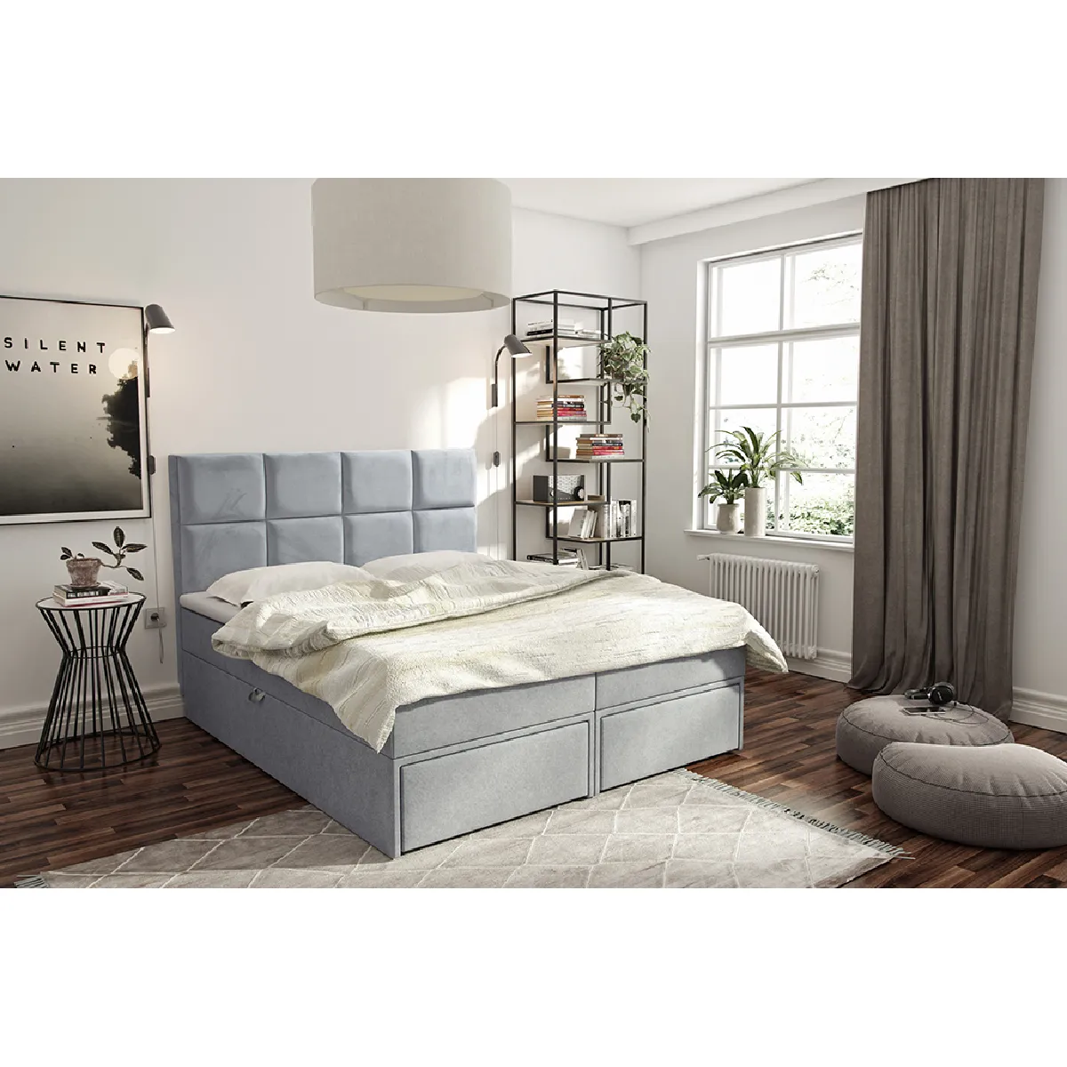 Le modèle GARDALUX c’est un lit adulte rembourré de haute qualité dans nos lits adultes modernes. La forme compacte du lit est en mesure d'offrir un confort de sommeil élevé grâce à des matelas ressorts ensachés de haute qualité intégrés sur lequel est posé un surmatelas pour encore plus de confort. La tête du lit avec des surpiqûres décoratives et un motif géométrique est non seulement esthétique, mais grâce à la mousse appropriée, il constitue également un support confortable pour la colonne vertébrale. Les grands coffres de rangement pour la literie à ouverture par le haut sont équipés de mécanismes à ressort pour faciliter le levage. Il y a aussi un système de poignées en tissu situées sur les côtés du sommier pour le soulever aisément. La taille optimale des coffres s'intègre bien au reste de la structure et garantit en même temps une grande quantité d'espace de stockage. De plus vous avez 2 tiroirs supplémentaires au pied du lit pour y cacher les chose à la porté de main. Le cadre en bois massif constitue un excellent et très solide cadre du lit.