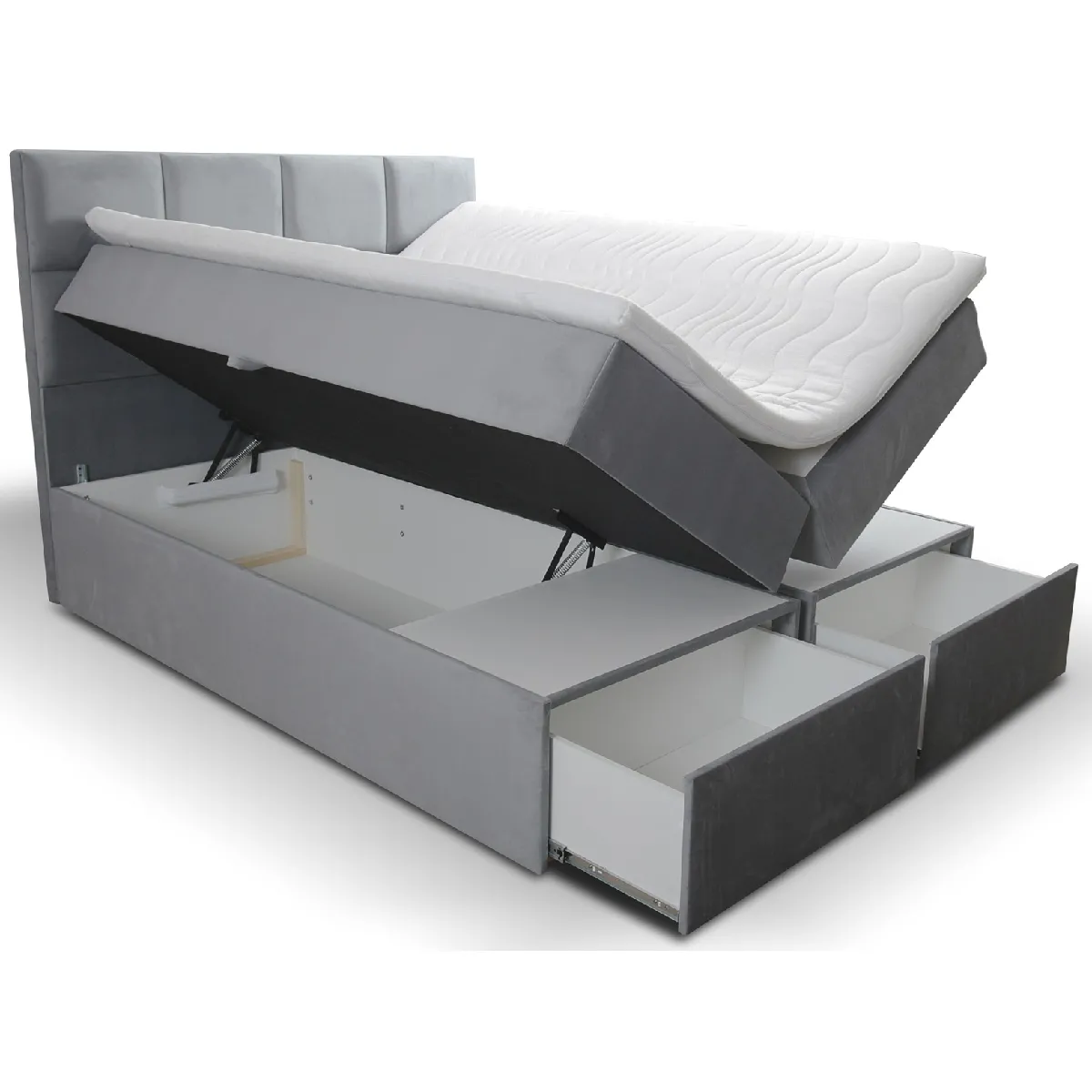 Caractéristiques principales : Matelas à ressorts ensachés avec 9 zones de confort, H3 POCKET ENERGY SPRING sur lequel est posé un surmatelas pour encore plus de confort. 2 grands coffres de rangement pour la literie. 2 tiroirs. Les vérins à ressort pour faciliter le levage. Cadre solide en bois massif. La tête de lit rembourrée par le tissu anti-tâches Casablanca. Le tissu se caractérise par une surface agréable et une résistance à l'abrasion. Il a des propriétés hydrofuges (Water Blocked), ce qui rend les meubles beaucoup plus faciles à nettoyer. Composition : 100 % polyester.