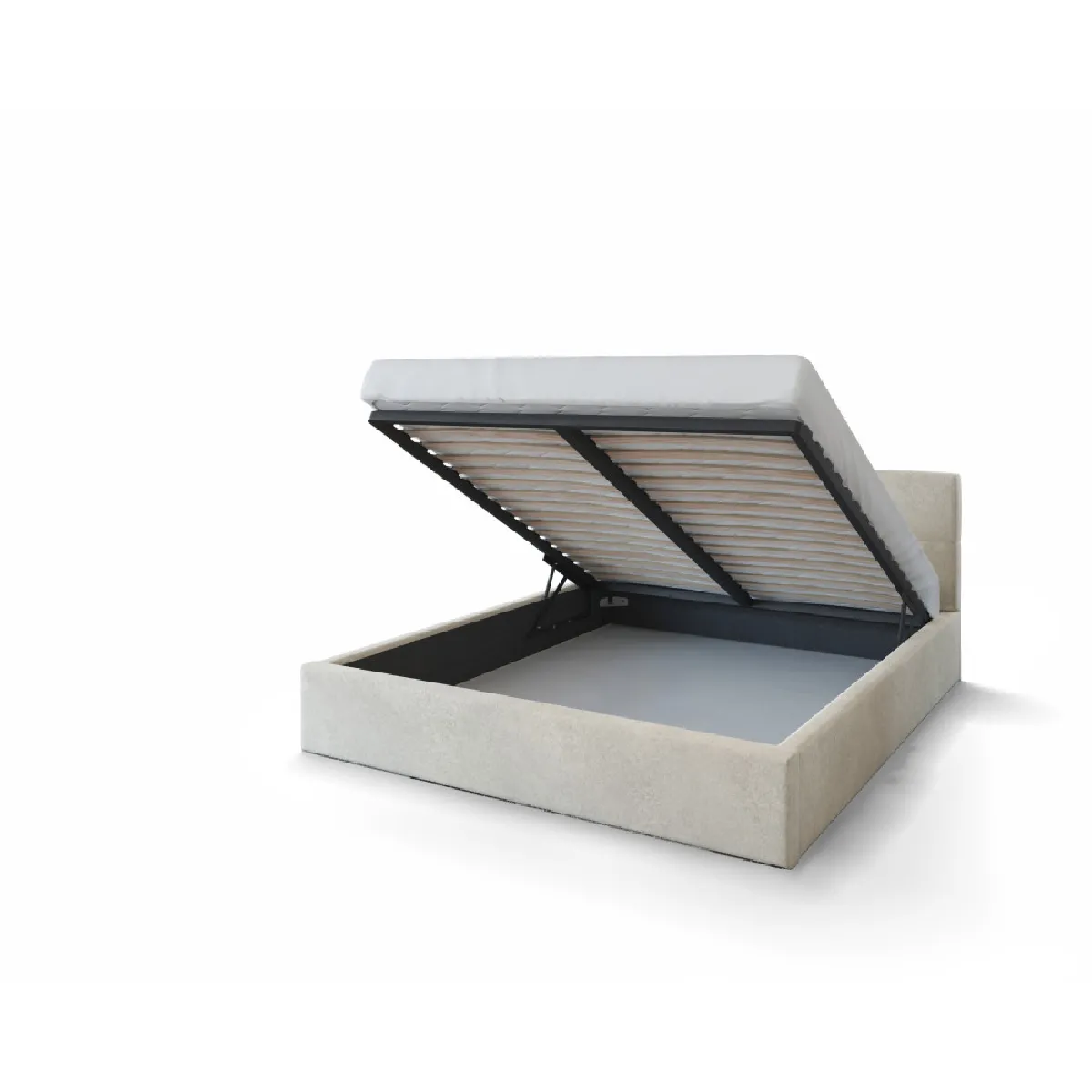 Afin d'augmenter la fonctionnalité du lit nous lui avons ajouté le coffre. Deux cylindres à gaz facilitent le levage, vous n'avez pas besoin d'utiliser beaucoup de force pour le soulever. L'espacement des lattes dans le cadre est approprié pour que le matelas posé dessus soit correctement ventilé et en même temps ne se déforme pas. Grâce à cela, ni l'humidité ni les acariens ne s'y déposent et nous pouvons profiter des conditions hygiéniques du sommeil chaque nuit. Des lattes résiliantes fonctionnent avec le matelas, ce qui améliore encore le confort. Ils ont étés fabriqués de manière à ne pas se délaminer ni se détériorer, et ils serviront pendant de nombreuses années.
