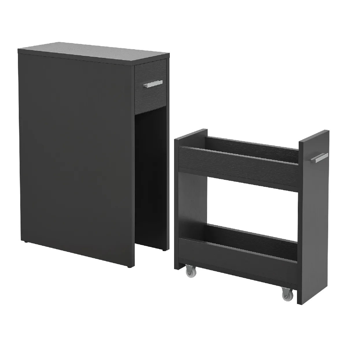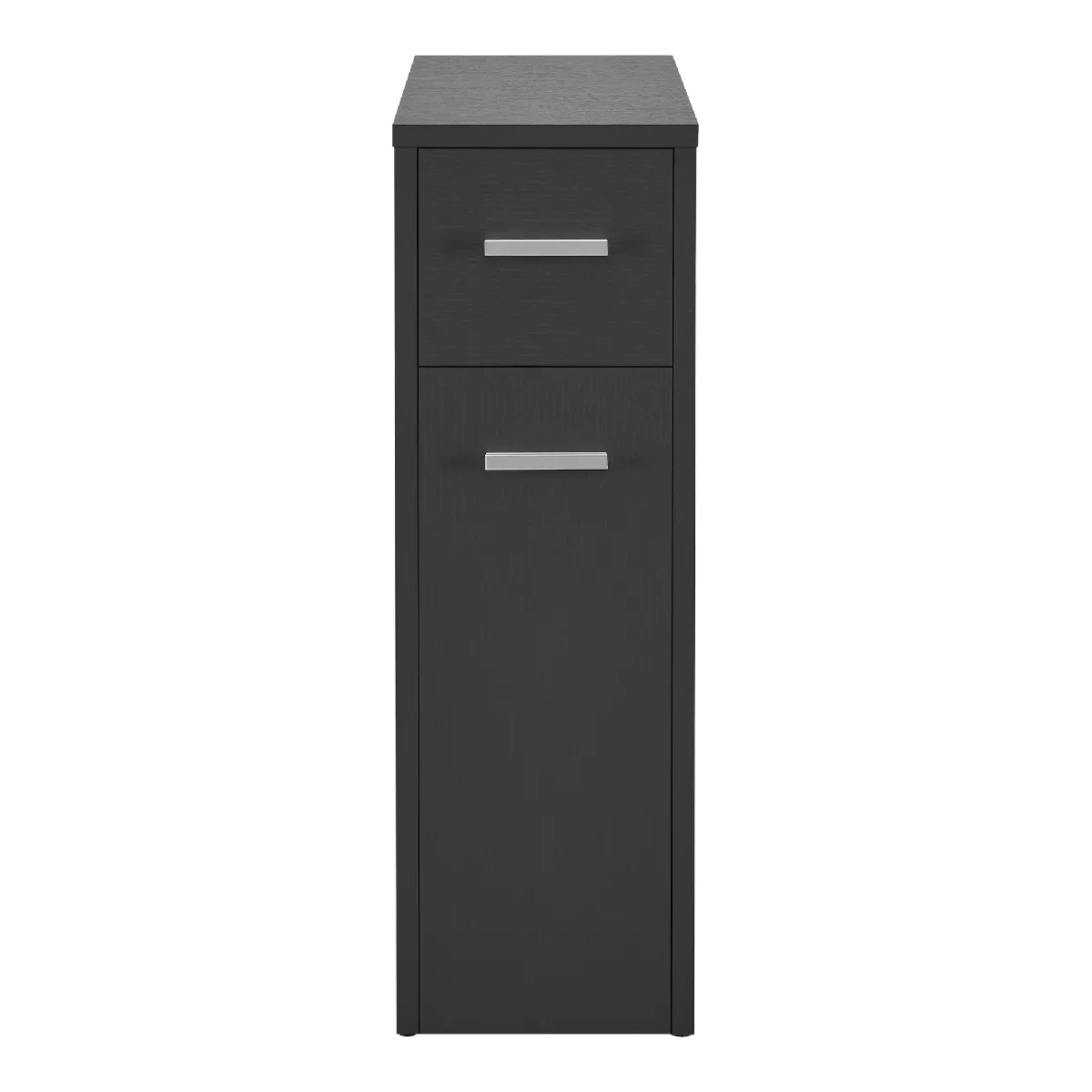 Commentaire vendeur : Meuble de rangement de salle de bain Cet organisateur pratique et polyvalent trouvera facilement sa place dans votre salle de bain. Sa construction reste peu encombrant, à l'aide de ce meuble vous pouvez créer un environnement bien organisé et tout restera facilement accessible. Description : - meuble à tiroirs étroit idéal pour les petites pièces- tiroir du bas sur 4 roues- idéal pour le rangement des produits de nettoyage, papiers de toilettes, produits d'hygiène entre autres - montage simple et rapide Dimensions : - totales (hauteur x largeur x profondeur) : 61 x 20 x 45 cm- tiroir du bas (hauteur x largeur x profondeur) : 45 x 16,4 x 45 cm- façade du tiroir du haut (hauteur x largeur) : 14 x 16,4 cm Matière : panneau de particules 15 mm Couleur : gris foncé Contenu de la livraison : - 1 x meuble de salle de bain- 1 x notice de montage