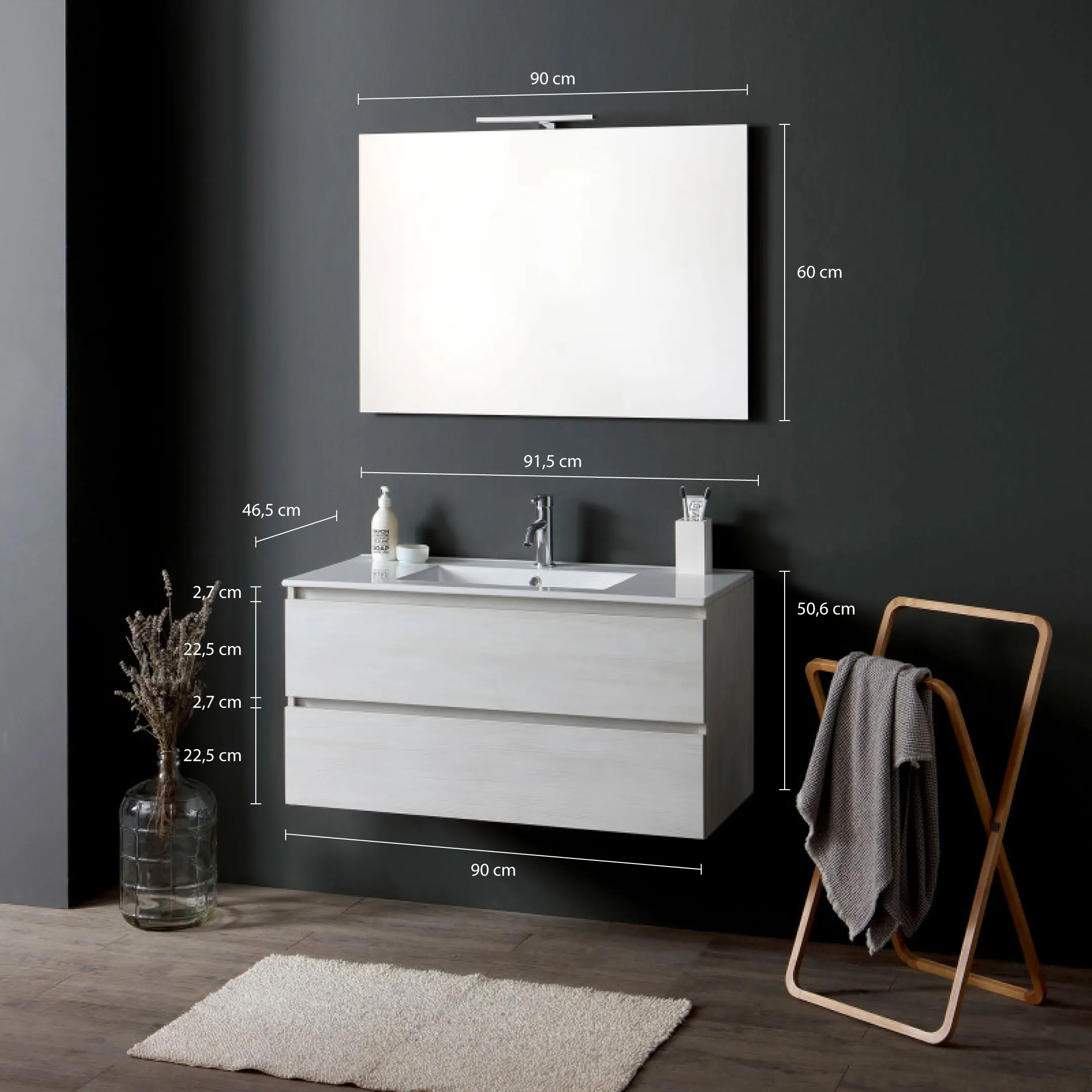 La base comprend une armoire suspendue en bois avec deux tiroirs, offrant une capacité de rangement pratique grâce à des côtés métalliques et à un coulissement complet. La fermeture en douceur des tiroirs améliore le confort d'utilisation et contribue à préserver les façades au fil du temps. Le lavabo intégré en céramique blanche présente une cuve dédiée, pour un usage quotidien simple et hygiénique, et s'intègre proprement à l'ensemble.