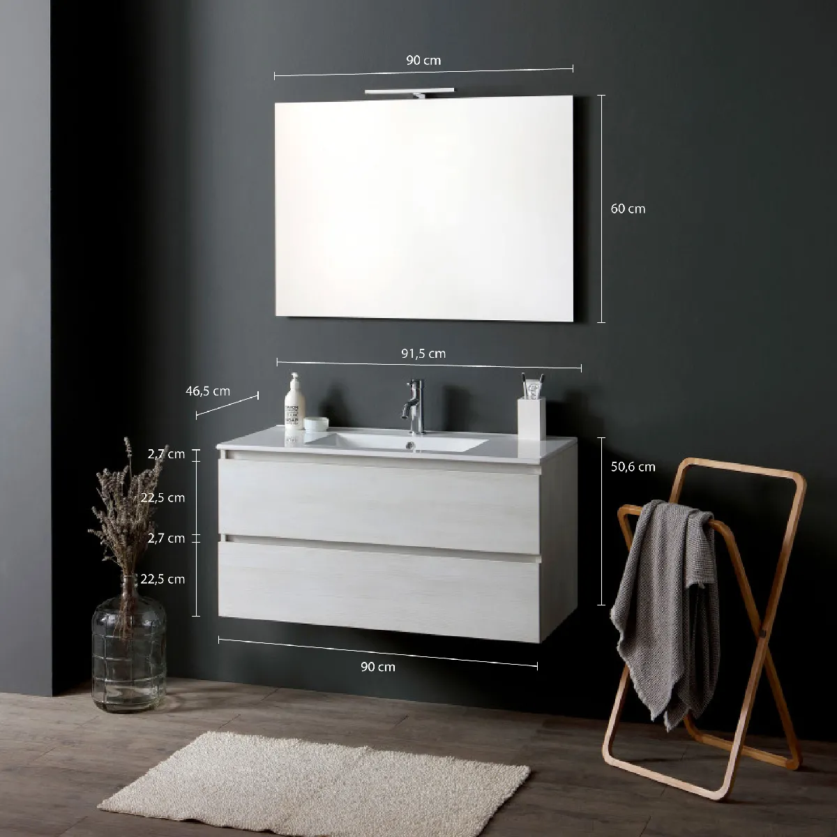 L'optimisation de l'espace se fait naturellement avec ce meuble suspendu doté de deux tiroirs entièrement extractibles et d'un lavabo en céramique blanche intégré. La finition en bois de teinte gris clair s'harmonise avec un design contemporain aux lignes épurées, adapté aux salles de bain actuelles. Le miroir réversible intègre une applique à LED positionnée sur la partie supérieure pour un éclairage fonctionnel du visage. La fermeture douce des tiroirs limite les chocs au quotidien, tandis que la structure suspendue facilite l'entretien du sol et la circulation dans la pièce.