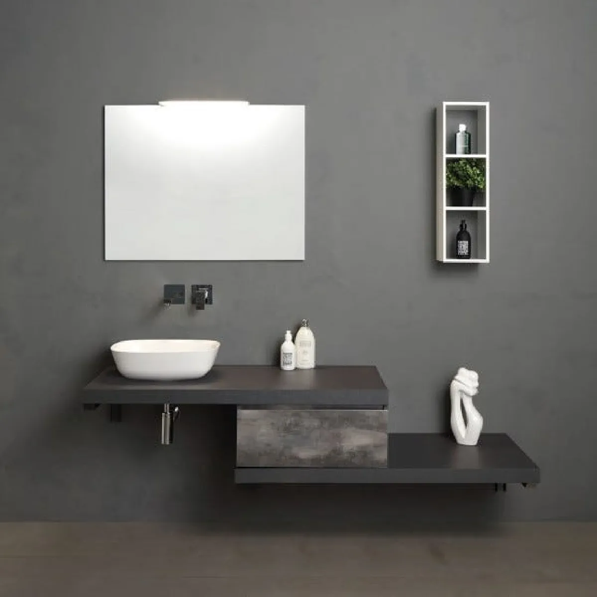 upport métallique en forme de "L", destiné à ancrer au mur les plans en bois de la ligne de meubles de salle de bains modulaires de style industriel Valentina , vous permettra de libérer votre imagination en créant une composition avec une ou plusieurs tablettes suspendues pour le lavabo, éventuellement alternées avec des bases à tiroirs classiques.