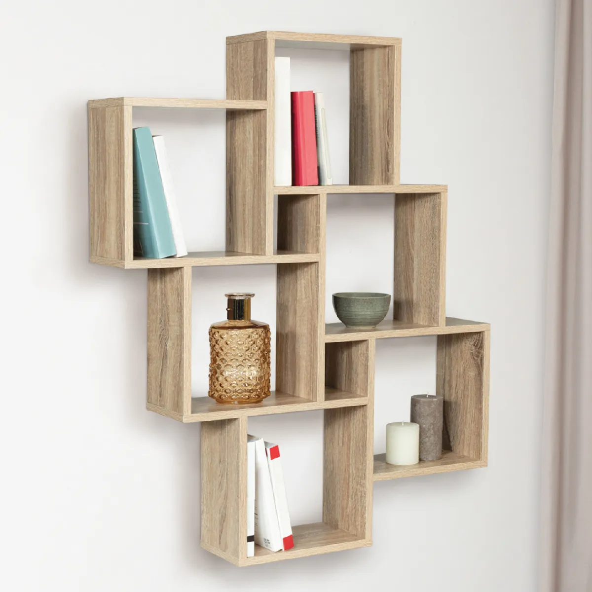Avec son style épuré et sa finition en bois façon hêtre, cette étagère murale double position habillera avec élégance les murs de votre intérieur, tout en offrant un grand espace de rangement. Le coloris bois lumineux de sa structure et sa fixation discrète mettra en valeur tous vos objets pour les transformer en véritables éléments de décoration.Facile d'installation, avec les attaches métalliques fournies, cette étagère design peut s'utiliser en position horizontale ou verticale. Esthétiques et fonctionnels, ses compartiments carrés de différentes tailles (26,5x26,5 cm et 11x11 cm) en font un meuble idéal pour ranger et exposer toute sorte d'objets. Livres, CD, cadres photos et autres bibelots, chaque objet trouvera sa place dans les différents emplacements de cette étagère murale.Idéale pour apporter décoration et modernité dans toutes les pièces de la maison, vous libèrerez ainsi de la place au sol ou dans vos placards et gagnerez en capacité de rangement !Pratique et déco, c'est l'étagère qu'il vous faut !Dimensions de l'étagère murale LUCASDimensions globales : Longueur 98 cm x largeur 16 cm x Hauteur 83 cmDimensions des grands carrés : 26,5 x 26,5 cmDimensions des 2 petits carrés du milieu : 11 x 11 cmMatériaux : Panneaux de particules de bois (PB)Épaisseur du bois : 1,5 cmKit de fixation inclusRetrouvez toutes nos étagères murales sur notre boutique en ligne