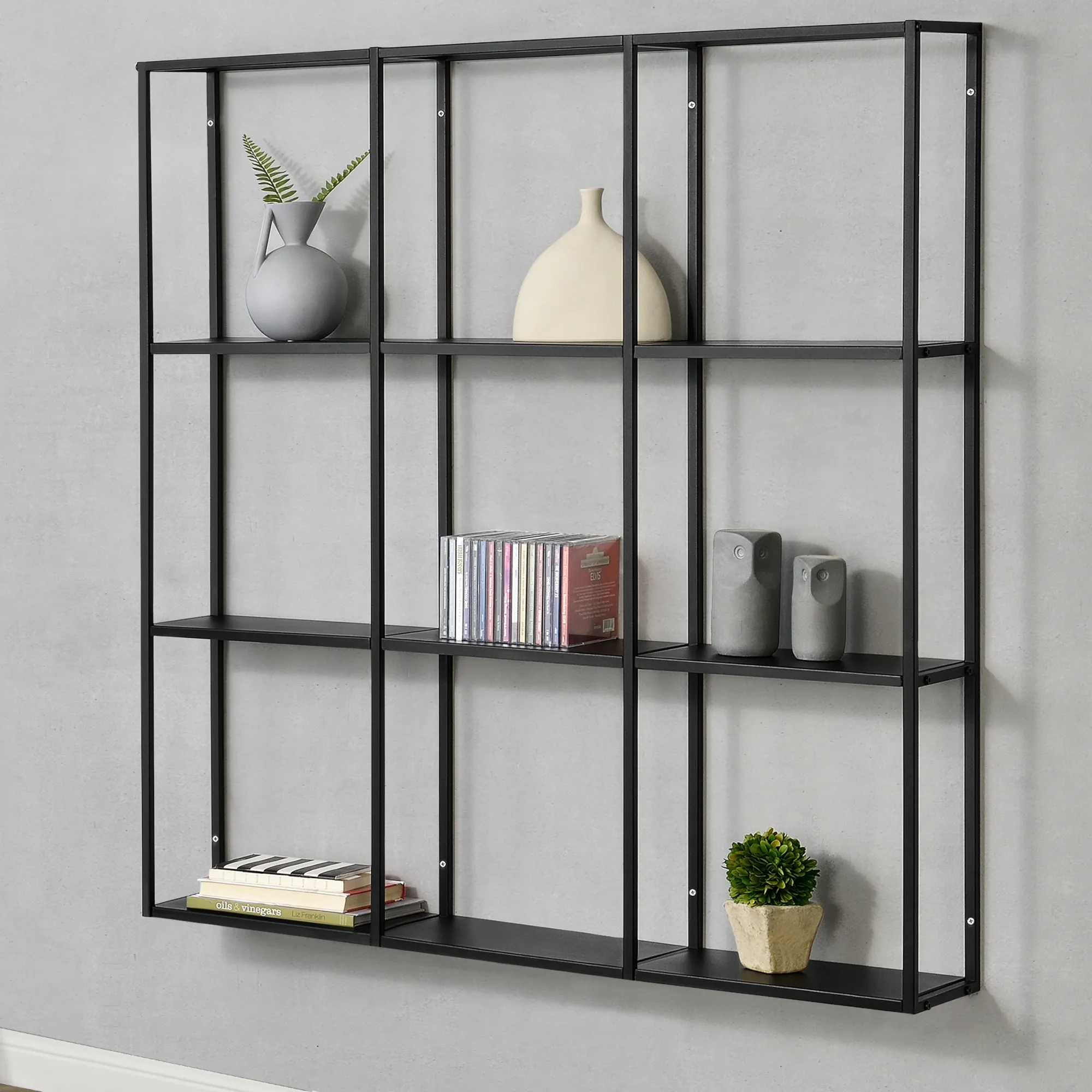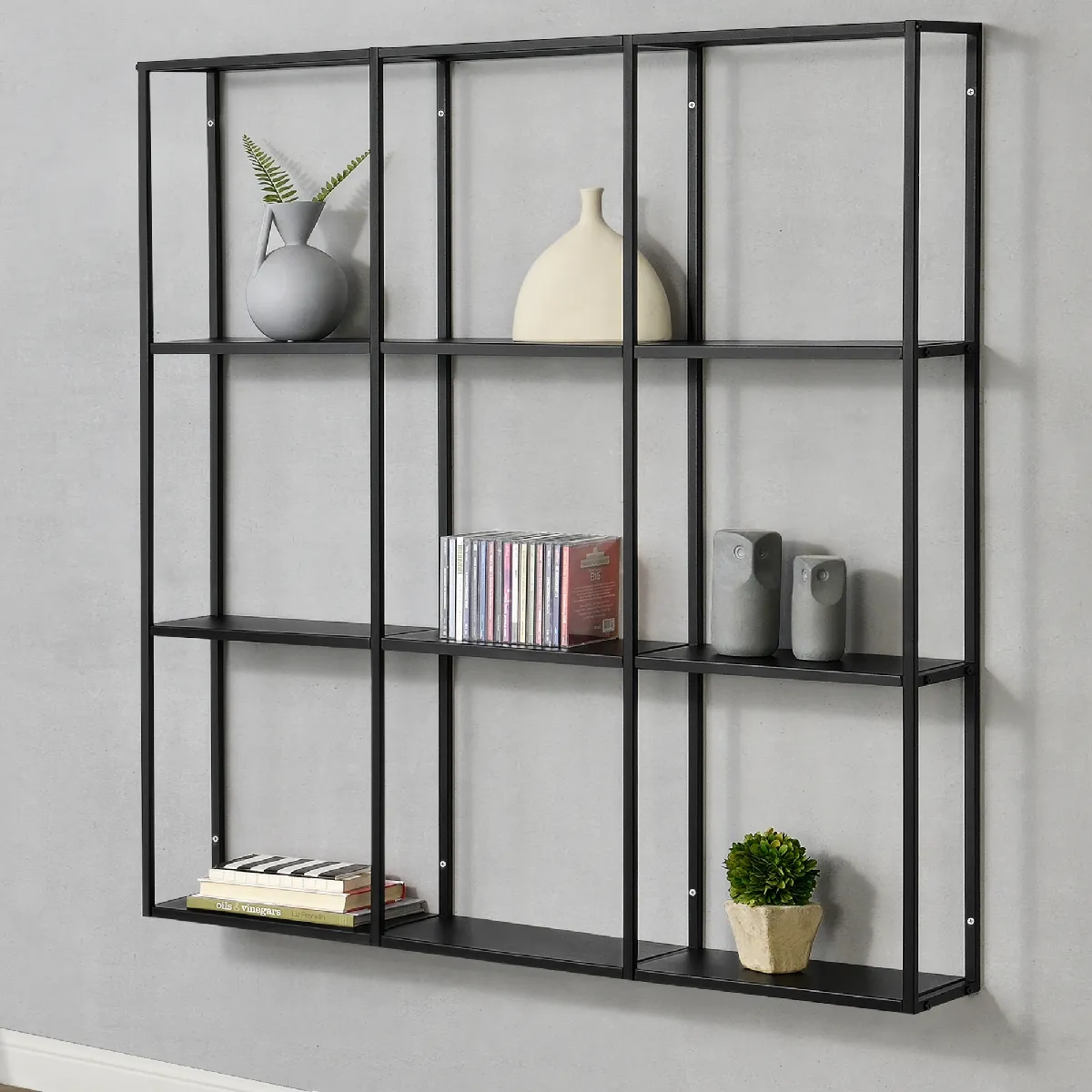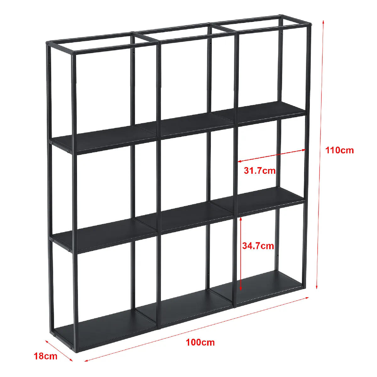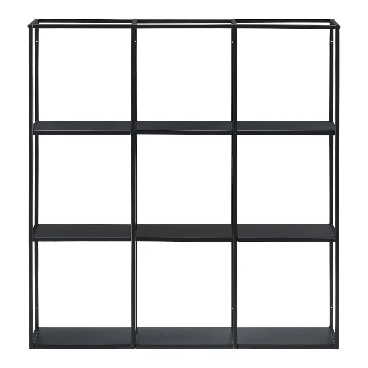 Neuf casiers ouverts offrent une capacité de rangement visible et ordonnée pour livres, décorations ou petits accessoires. La structure en métal noir assure une présentation homogène avec lignes contemporaines, tout en restant facile à intégrer dans un salon, un bureau ou un couloir. Chaque niveau supporte jusqu'à 5 kg, ce qui convient aux objets du quotidien sans surcharge. L'entretien se limite à un simple dépoussiérage, idéal pour un usage régulier.