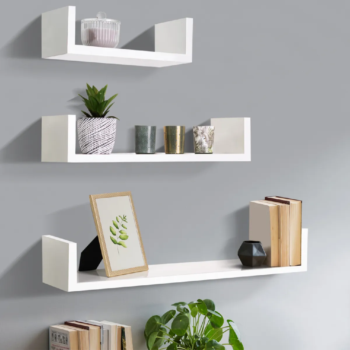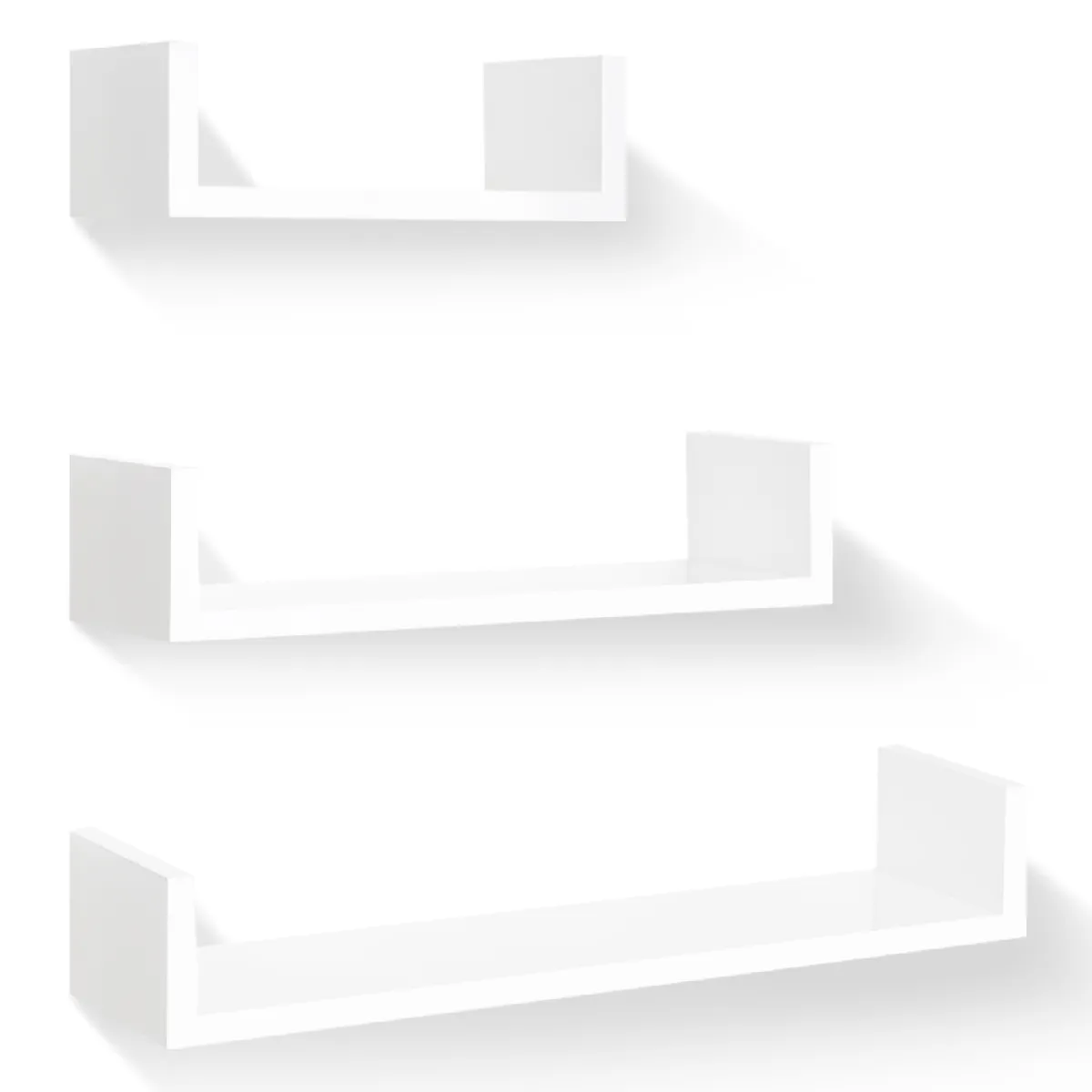 On ne compte jamais assez de rangements dans son intérieur !Pratiques, fonctionnelles, et modulables, les 3 étagères murales suspendues vendues en lot de 3 apporteront une touche design et moderne à votre intérieur, qu'il soit contemporain ou plus classique. Simples, flottantes, grâce à leurs lignes droites et épurées, les tablettes ne surchargeront pas votre lieu de vie et donneront du volume à votre pièce.Avec leur joli coloris blanc brillant lumineux et neutre, et leur finition laquée soignée vos objets de décoration préférés seront mis en valeur.Indépendantes, les étagères peuvent être utilisées dans la même pièce, en continuité ou séparément. Installez-les par 1, par 2 ou par 3 selon vos envies !Leur utilisation est multiple et infinie ! Dans la salle de bain, pour avoir vos produits de beauté et votre parfum à portée de main, les toilettes, la cuisine, le couloir, dans votre chambre à coucher pour y disposer votre réveil et votre livre de chevet, dans la chambre de votre enfant, pour y exposer sa collection de figurines et ses histoires du soir hors d'atteinte, ou dans le salon pour accueillir petites plantes vertes, cadres, bougies, et petits objets de déco fragiles hors de la portée de vos animaux.Avec leur forme en U originale et astucieuse, vos livres, CD, DVD et blue-ray seront maintenus sur les côtés. Installez-les de façon sobre ou combinez-les en forme d'escalier une face vers le bas et une face vers le haut pour un effet design garanti. Multipliez la surface de rangement et donnez de la perspective à la pièce !Faciles d'installation, avec les attaches métalliques fournies, le support est invisible à l'oeil nu !Pratique et déco, ce lot de 3 étagères de rangement à petit prix servira à toute la famille !Dimensions des étagères murales blanches laquéesDimensions de la grande étagère : Longueur 60 cm x Largeur 15 x Hauteur 10 cmDimensions de l'étagère moyenne : L. 45 cm x L. 15 x H. 10 cmDimensions de la petite étagère : L. 30 cm x L. 15 x H. 10 cmMatériaux : Panneaux de particules mélaminés, épaisseur 18 mmCharge supportée : 10 kgKit de fixation inclusÀ monter soi-même