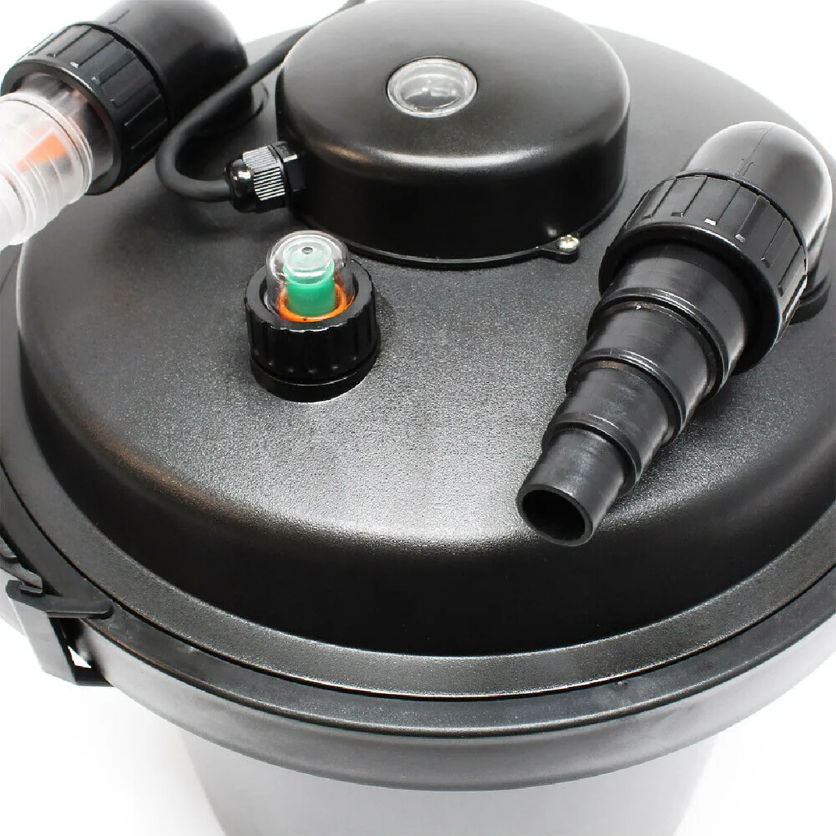 Un filtre de bassin à pression SunSun CPF-500 à fonction mécanique et biologique, avec un stérilisateur UVC intégré de 18 watts.