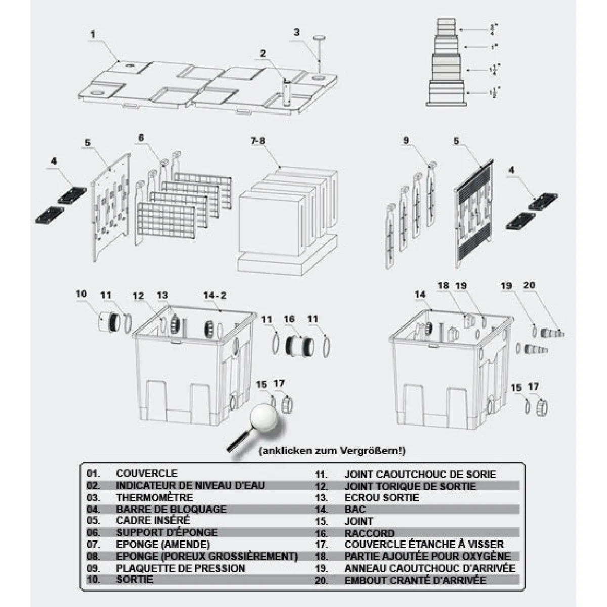 Nombre Appellation 50108-14-2 1 Bac Phase 2 (milieu) 50108-01 1 Couvercle 50108-07 2 Eponge filtre (fine) 50108-08 2 Eponge filtre (grossière) 50108-04 4 Barrière de fermeture 50108-05 2 Cadre d'insertion 50108-06 4 Support d'éponge filtre 50108-09 4 Plaque de pression d'éponge filtre 50108-11 2 Joint caoutchouc (sortie) 50108-12 2 Joint torique (sortie) 50108-13 2 Ecrou 50108-15 1 Joint 50108-17 1 Bouchon obturateur 50108-08A 1 Tapis japonais 50108-16 1 Connecteur Contenu de la livraison