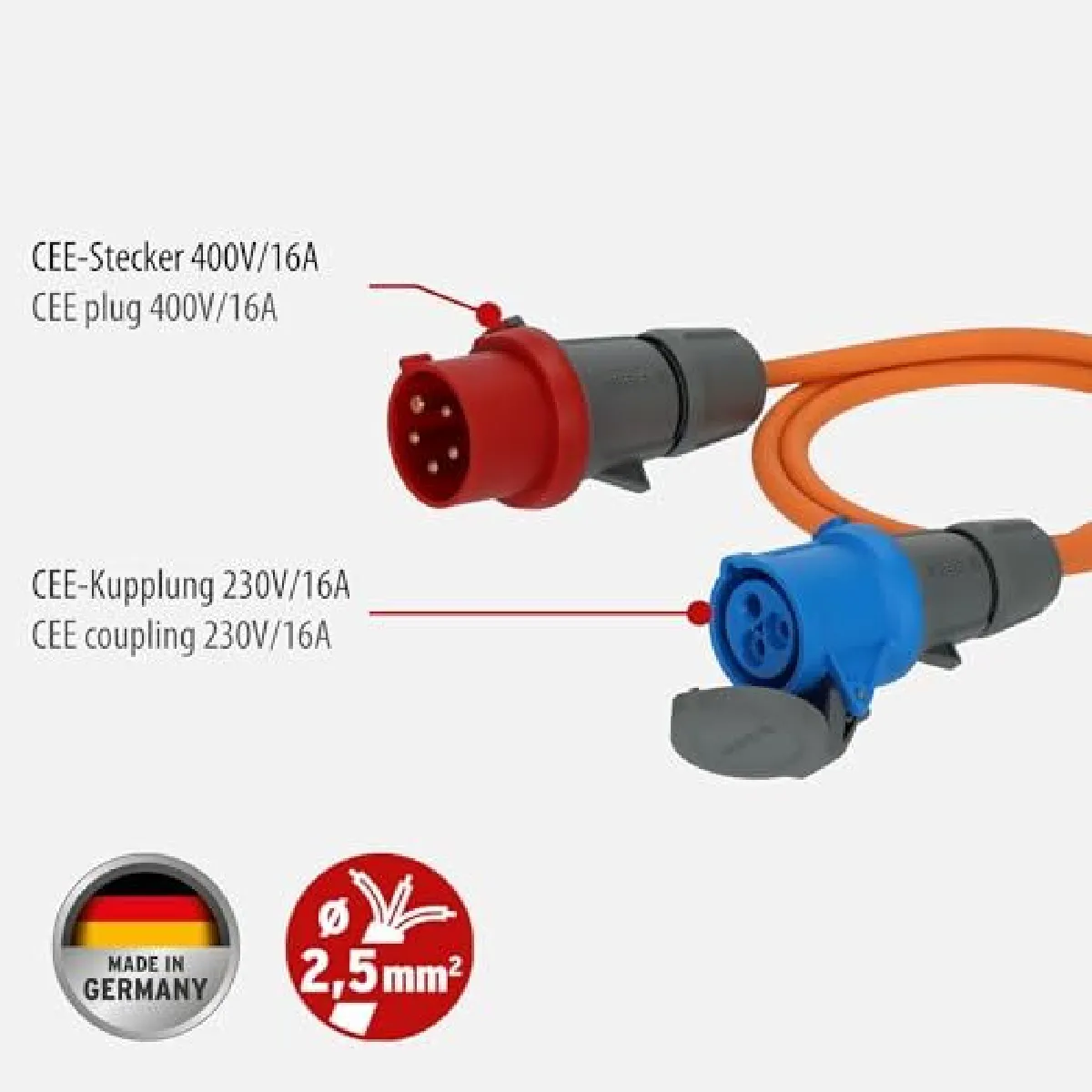 Adaptateur CEE H07RN-F 3G2,5 – IP44 – 230V/16A vers 400V/16A – Caoutchouc néoprène – Usage extérieur/marine