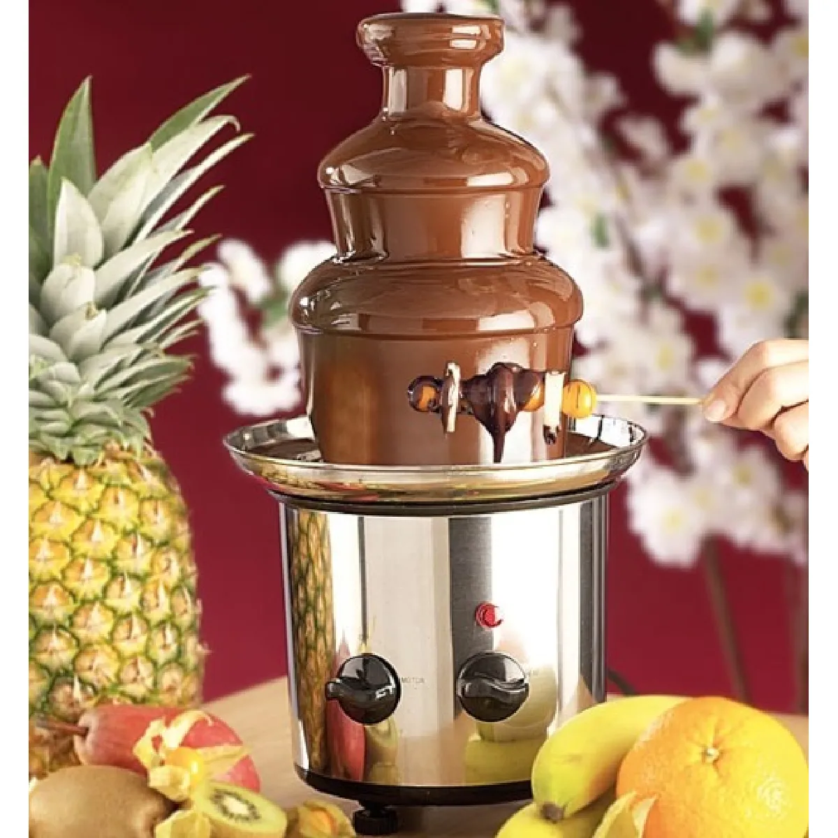 L'alimentation 230 V assure une compatibilité domestique courante. Avec un poids de 1,7 kg, l'appareil reste suffisamment stable sur la table tout en étant transportable. La présentation en cascade sur plusieurs plateaux met en valeur les morceaux de fruits et autres douceurs, et contribue à un service régulier durant l'événement, du premier au dernier passage.