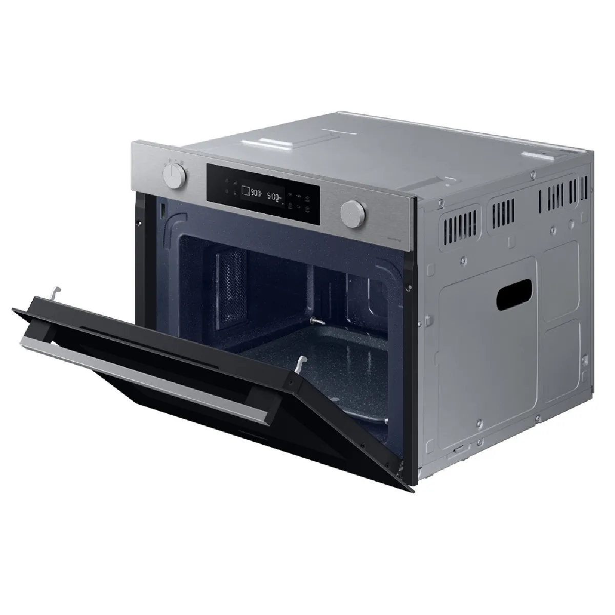 Avec son volume de 50 l, ce modèle encastrable accepte des récipients larges et des préparations familiales. Les dimensions d'encastrement 44.6 x 56 x 54.9 cm facilitent l'intégration dans une niche standard, tandis que la porte à ouverture latérale permet un accès frontal pratique. Les 7 niveaux de puissance jusqu'à 900 W couvrent le réchauffage quotidien, la cuisson de portions importantes et la décongélation. L'écran LED et les commandes électroniques assurent des réglages précis et une lecture claire en cours de cuisson.