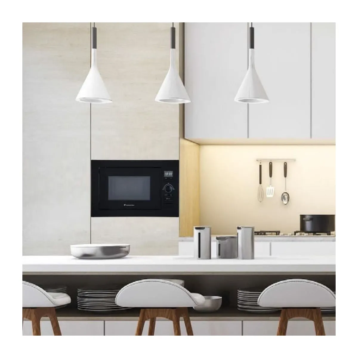 Avec son format encastrable, ce micro-ondes s'insère dans un meuble dédié pour un plan de travail dégagé. Ses dimensions extérieures de 59,5 x 38,8 x 40 cm (l x h x p) facilitent l'intégration dans une niche compatible. Le poids de 18,5 kg participe à une installation stable, tandis que le coloris noir s'accorde discrètement à de nombreux ensembles. L'appareil n'est pas connecté, ce qui assure un pilotage direct depuis le bandeau, sans configuration réseau.