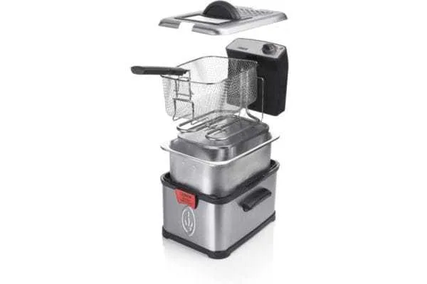La zone froide située sous l'élément chauffant recueille naturellement les particules. Associée au filtre de sécurité d'huile, elle réduit les projections lors de la cuisson d'aliments congelés et limite l'apparition de dépôts. Le couvercle muni d'un filtre anti-odeur et d'une vitre permet de surveiller la friture tout en contenant les émanations. L'appareil reste autonome sur le plan de travail et sa cuve intérieure en acier inoxydable amovible simplifie autant le changement d'huile que le nettoyage après usage.