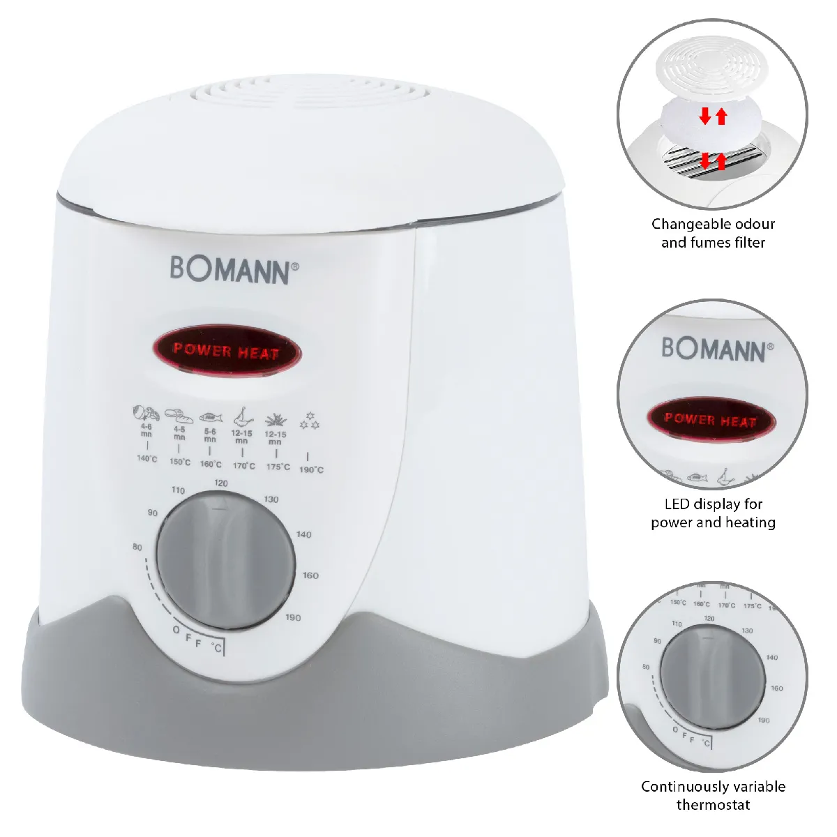 - La friteuse fondue Bomann FFR 1290 CB avec 6 fourchettes à fondue, vous permet de varier les plaisirs. D'une capacité de 840 watts, elle peut accueillir 1L d'huile et chauffe rapidement pour une dégustation rapide. Le thermostat est réglable pour une chaleur optimale avec un voyant de contrôle vous indiquant son fonctionnement. Elle est dotée d'une protection contre la surchauffe pour assurer sa sécurité et ses parois froides évite les risques de brûlures. Le couvercle est amovible pour plus de pratique.