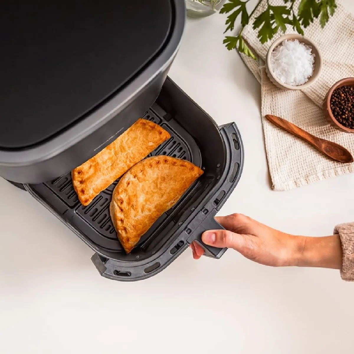 Le design compact et noir s'intègre facilement sur un plan de travail. La protection contre la surchauffe ajoute une couche de sécurité lors des sessions prolongées. La puissance de 1500 W permet d'enchaîner plusieurs recettes avec une récupération thermique rapide entre les cycles. La capacité de 5,5 L prend en charge des accompagnements, des snacks ou des plats complets pour deux, tout en préservant une gestion simple grâce au panneau tactile multifonction.