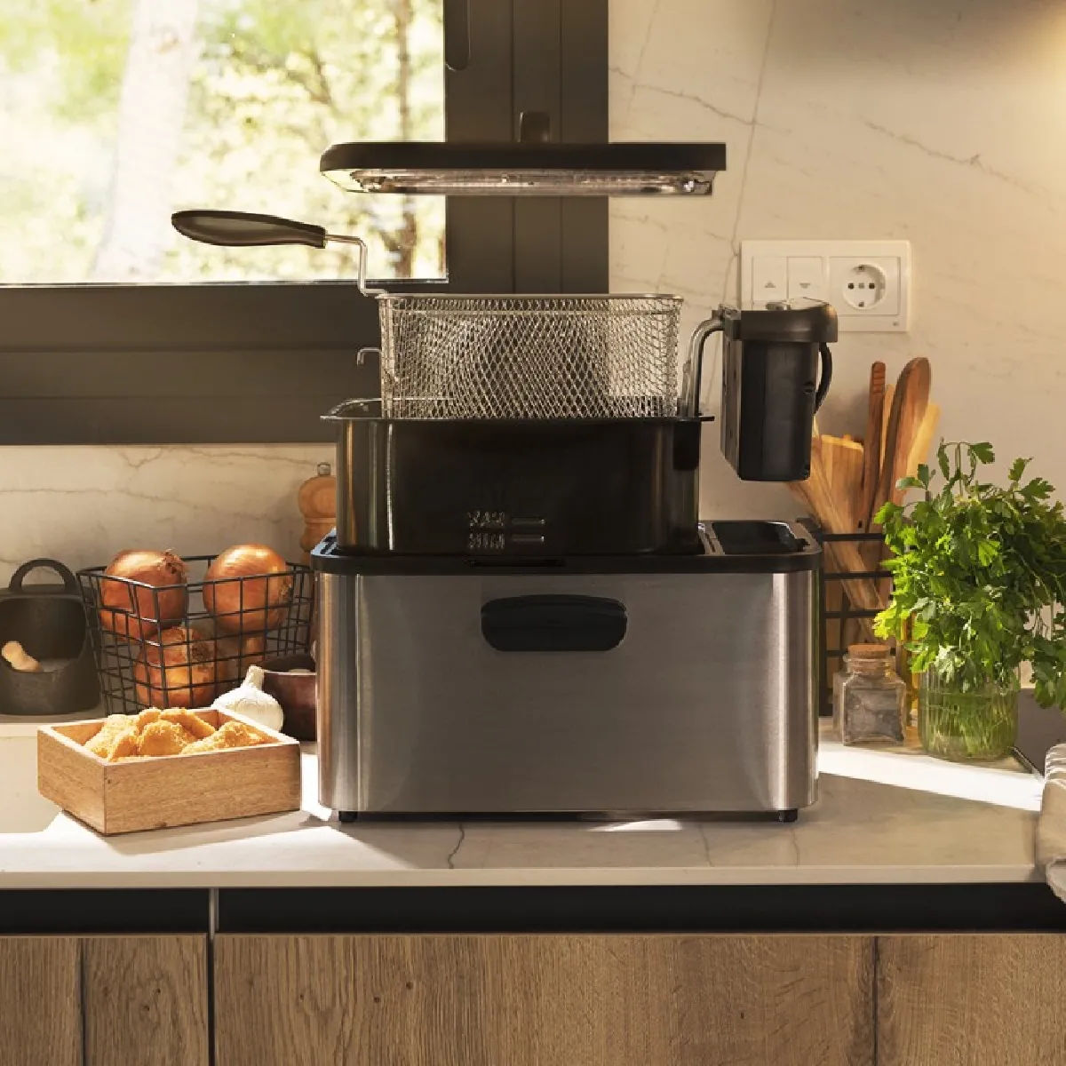La cuve et le corps en acier inoxydable offrent une structure robuste et simple à nettoyer. Le couvercle en inox dispose d'un filtre antiodeurs pour limiter la diffusion durant la cuisson. La cuve, le panier et le filtre OilCleaner sont compatibles lavevaisselle, ce qui réduit les manipulations et accélère le nettoyage après usage. Le réservoir amovible facilite la vidange de l'huile et l'accès à la cuve pour un entretien méthodique.