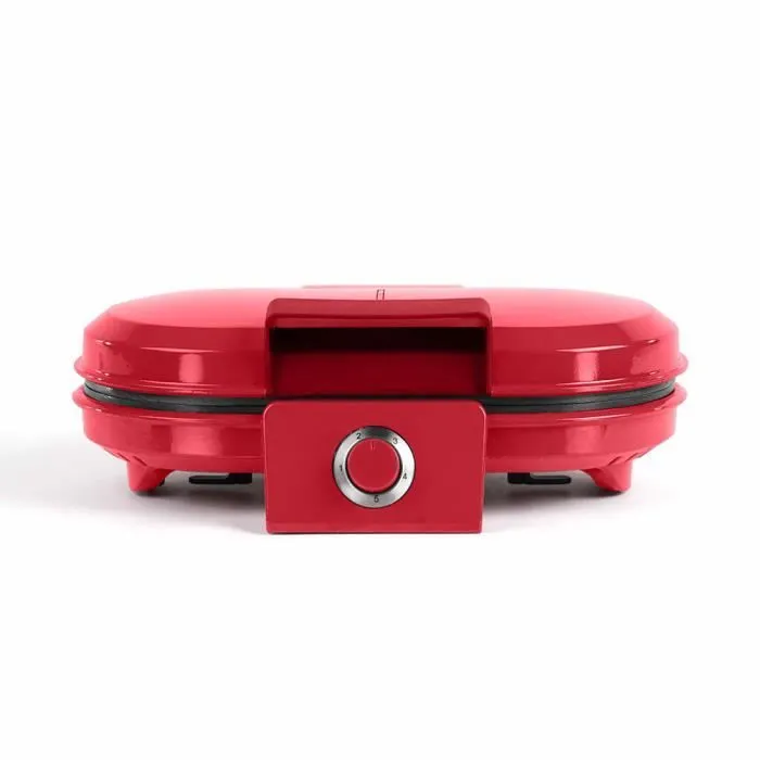 Avec son gabarit léger de 1 kg, ce gaufrier se déplace et se range facilement entre deux utilisations. La forme cur apporte une présentation ludique pour les enfants comme pour les adultes, sans étape supplémentaire. Les plaques antiadhésives aident à limiter les résidus, ce qui réduit le temps de nettoyage. Le corps en inox et finition rouge s'intègre visuellement dans diverses cuisines tout en restant simple à essuyer après la cuisson.