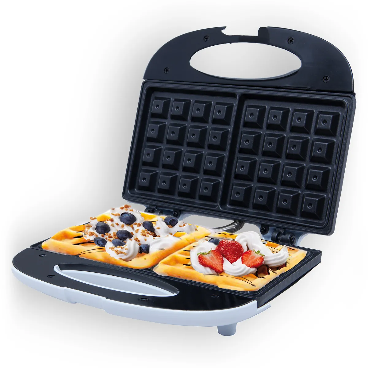 Deux gaufres belges épaisses peuvent être cuites simultanément.