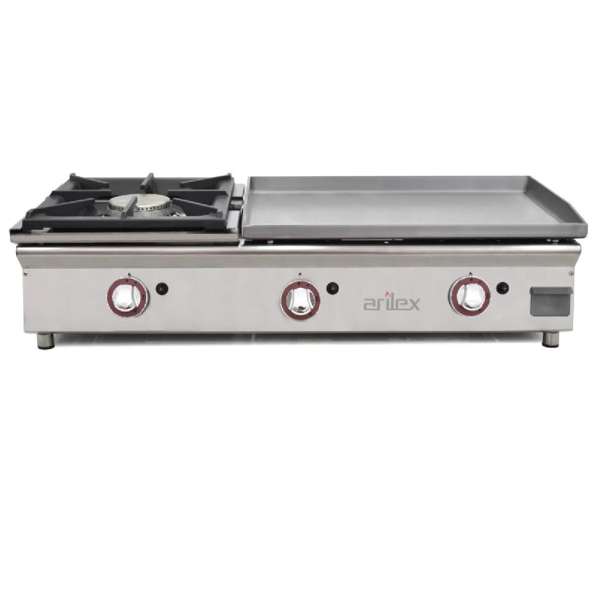 Arilex Plancha à Gaz | #html-body [data-pb-style=HQO1Y4X]{justify-content:flex-start;display:flex;flex-direction:column;background-position:left top;background-size:cover;background-repeat:no-repeat;background-attachment:scroll}Construction en acier inoxydable satiné avec une épaisseur de 1 mm.Modèle PLG : Plaque de cuisson de 6 mm d'épaisseur. Plastron de 36 mm de hauteur. Fabriqué en acier laminé avec protection anti-oxydation.Modèles en chromé dur avec valve thermostatique de 300°C qui régule le feu permettant d'obtenir la température adéquate de la plaque de cuisine, réduisant ainsi la consommation de gaz.Réchaud avec thermocouple à grand pouvoir calorifique de 6 Kw. Grill de fer en fonte de grande dureté totalement démotable pour le nettoyage.Commande de bakélite chromée de grande qualité avec marqueur maximum /minimum.Collecteur de graisse frontale de grande capacité et totalement extractible fabriqué entièrement en acier inoxydable.Allumage par piézoélectrique (1 par valve à gaz).Pieds hauts réglables grande soliditéBrûleur design ARILEX avec sortie de flamme sur tout le contour assurant une répartition uniforme de chaleur sur toute la plaque. Sans "zone froides". Grande puissance calorifiqueavec thermocouple de sécurité.R a c c o r d e m e n t d e g a z a v e c p a r t i e transversale qui facilite l'installation dans des lieux où l'agencement de l'espace est essentiel. Sont fournies des sorties pour gaz propane et butane et des injecteurs pour changement au gaz naturel.Type : L