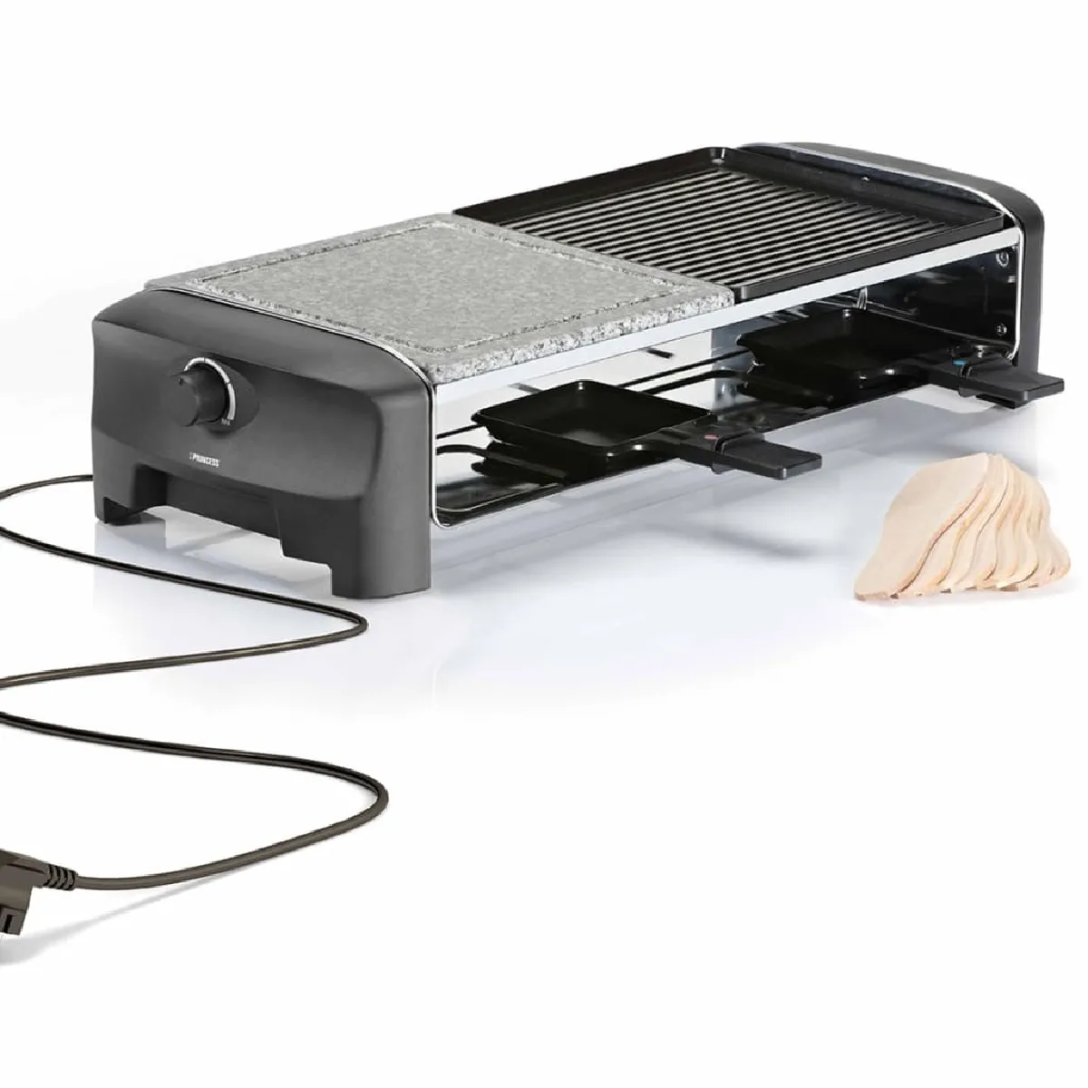 La grille à raclette est dotée d'une plaque en aluminium moulé sous pression, qui peut être utilisée des deux côtés. Ce modèle contient également 8 casseroles pour la cuisson de différents plats, qui peuvent servir 8 personnes en même temps. Cet ensemble est facile à nettoyer et toutes les pièces sont lavables au lave-vaisselle.