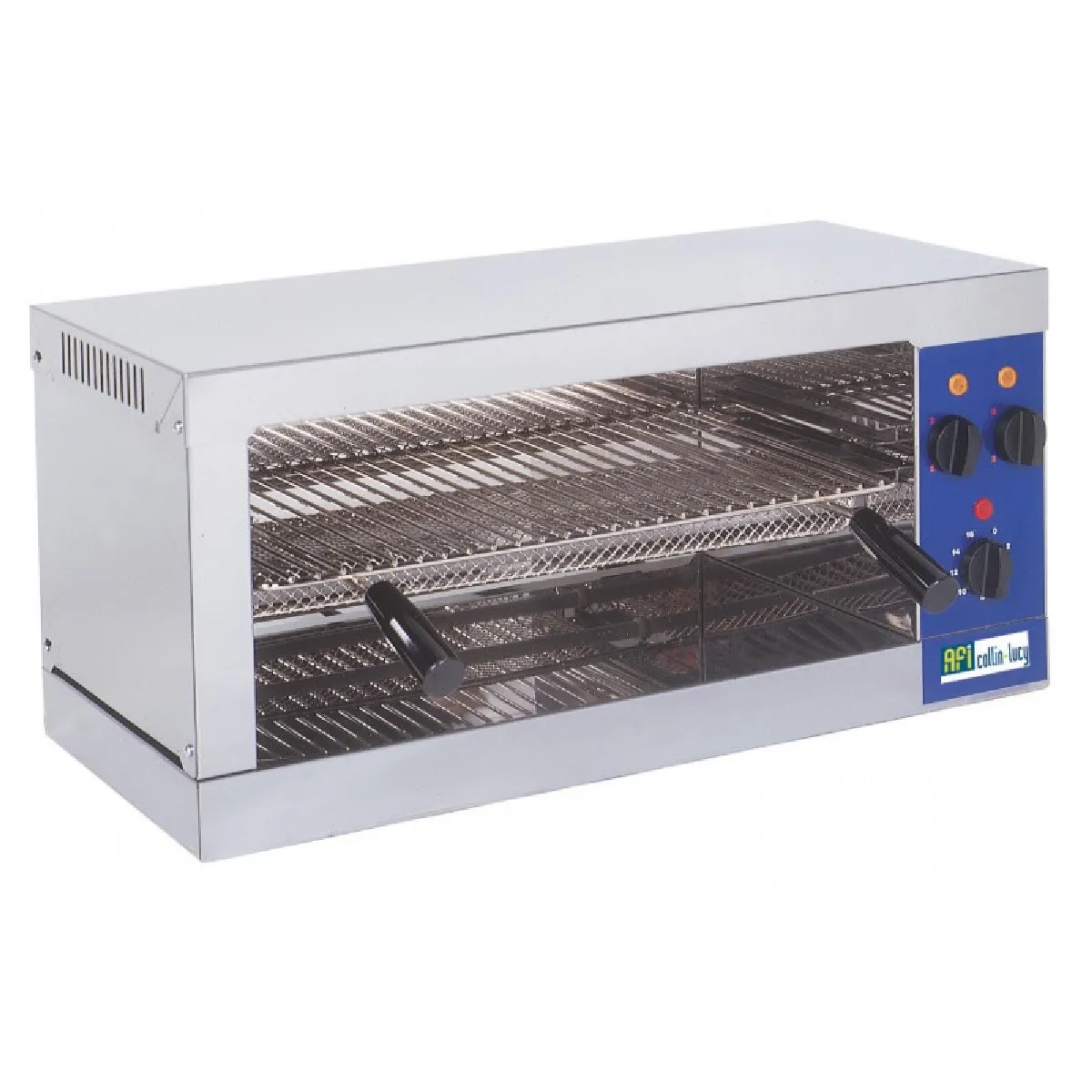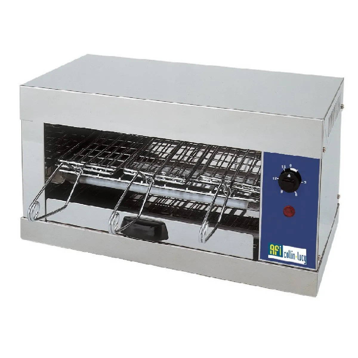 AFI Collin-Lucy toaster. Toaster professionnel électrique de la marque Collin Lucy fabriqué en acier inoxydable, avec des résistances à tubes quartz renforcées, une minuterie de 0 à 15 minutes.Témoins lumineux de fonctionnement et équipé d'une grille de protection des tubes quartz, ce toaster professionnel est livré sans pince.Sélecteur de chauffe sol/voûte (Modèle Pro)Tension: 230 V MonoLivrés sans pinceEspace de chauffe : 320 x 220Niveaux : 1Puissance (kW) : 2Poids (kg) : 8Largeur : 440 mmProfondeur: 240 mmHauteur: 250 mm.
