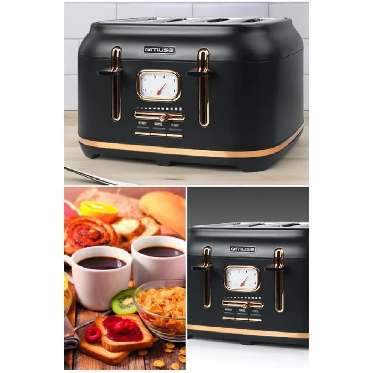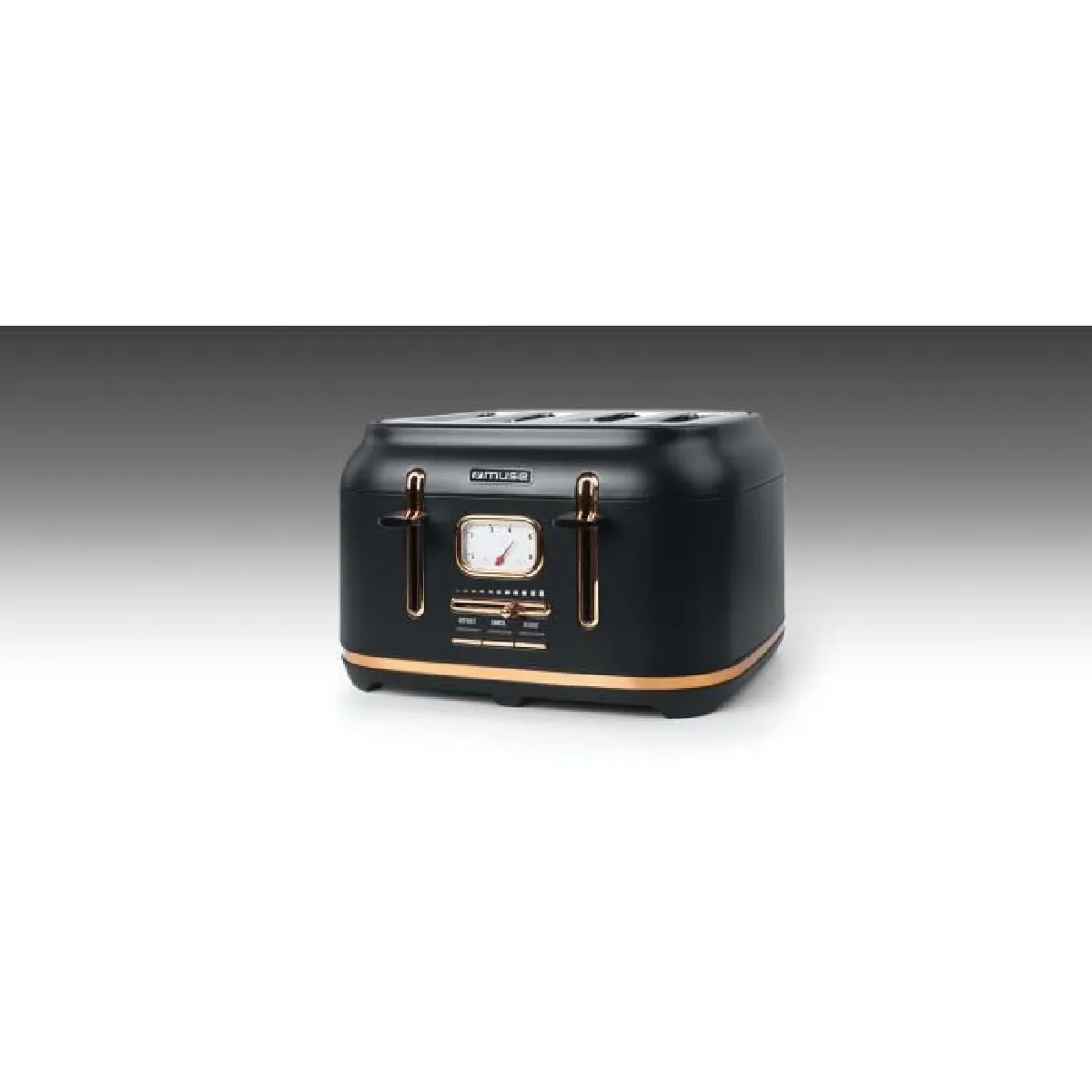 Le petit-déjeuner gagne en efficacité avec un grille-pain à 4 fentes pour gérer plusieurs tartines en même temps. Son design rétro noir et doré en acier inoxydable et galvanisé s'intègre facilement sur le plan de travail tout en restant simple à entretenir. Le tiroir ramasse-miettes amovible facilite le nettoyage quotidien et limite l'encombrement. La fonction décongélation pour du pain surgelé offre une mise en route rapide sans étape préalable. La puissance de 1800 W pour une chauffe homogène aide à obtenir des tranches dorées de manière régulière. Un appareil pratique pour enchaîner les toasts du matin ou les collations à toute heure.