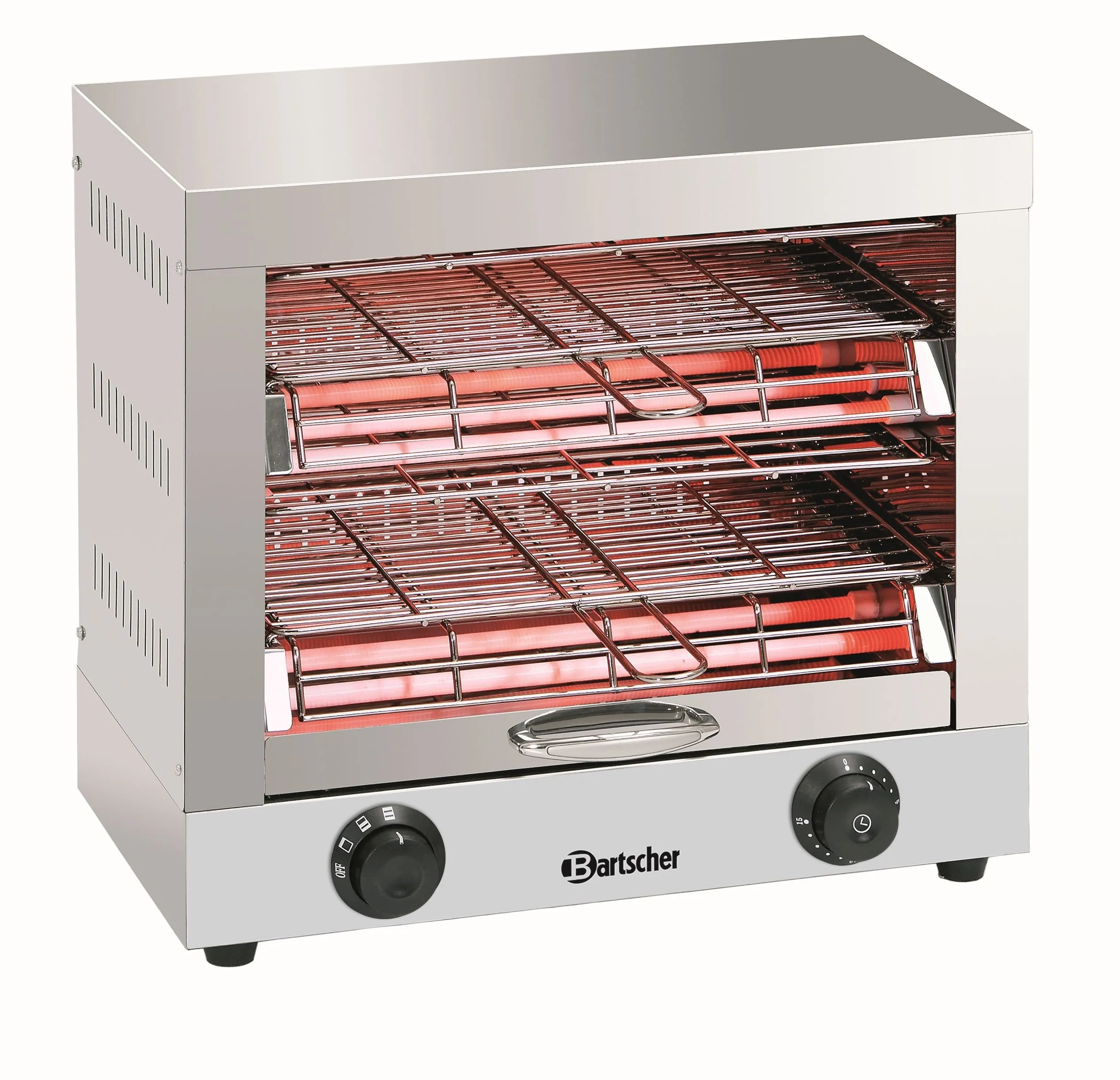 Le chauffage par quartz à réponse rapide permet un brunissage homogène pour des cycles réguliers, que ce soit pour des toasts, des gratins ou des sandwiches chauds. L'appareil en acier inoxydable robuste avec deux niveaux de cuisson offre une surface intérieure utile de 355 x 240 mm et une hauteur de 50 mm par étage. La minuterie jusqu'à 15 minutes avec commande électronique et manette facilite la répétabilité des résultats en service continu. Avec 3 000 W, il assure une montée en température efficace tout en restant compact avec format 40 x 37 x 40,5 cm et tiroir ramasse-miettes pour un entretien simple en fin de poste.