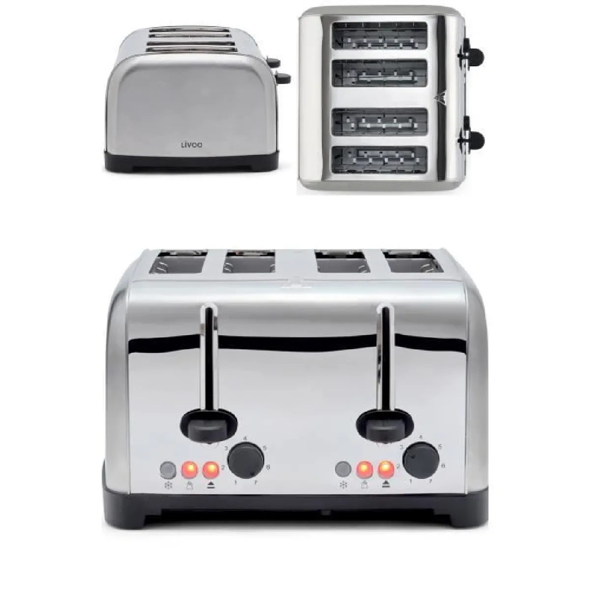 Grille-pain 4 fentes larges - Inox - 1500 W - Décongélation, réchauffage, arrêt - Thermostat 7 niveaux - Tiroir ramasse-miettes - LED