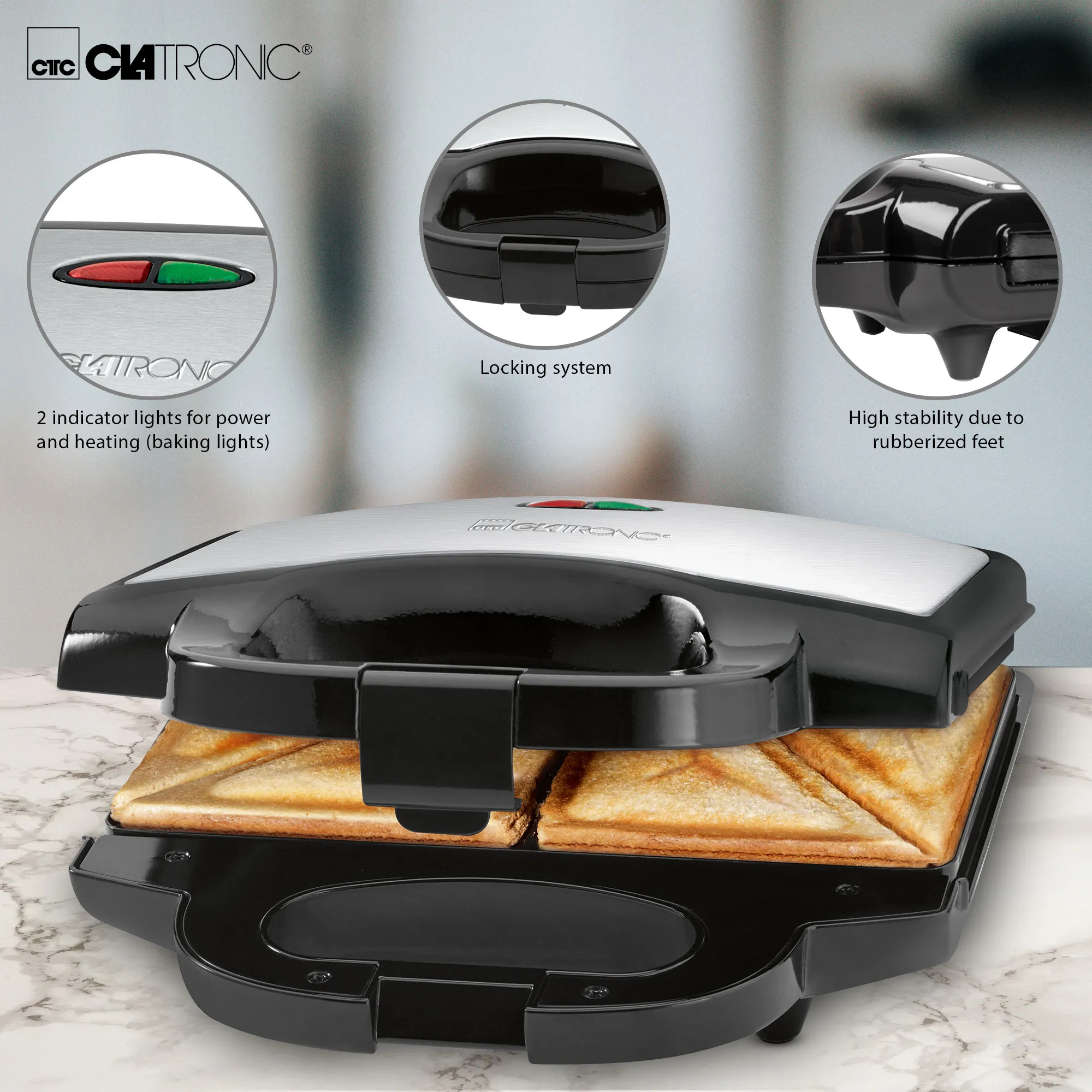 Appareil à croque-monsieur et sandwiches - Revêtement antiadhésif - Plaques inox - Contrôle automatique de la température - Voyants de chauffe - Verrouillage - Protection surchauffe - Rangement du cordon