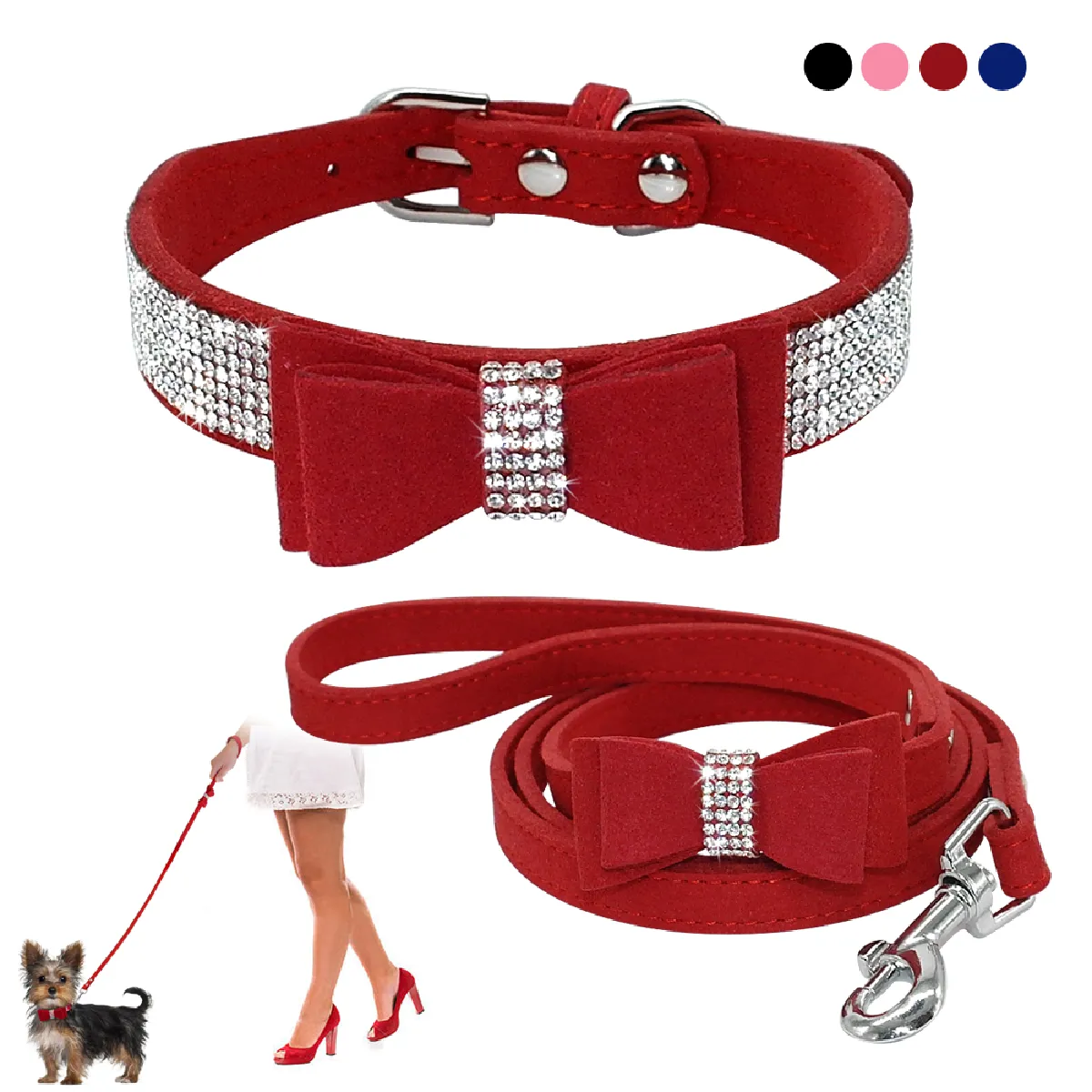 Collier et laisse pour chien - Cuir suédé - Insertions strass - Couleur Rouge