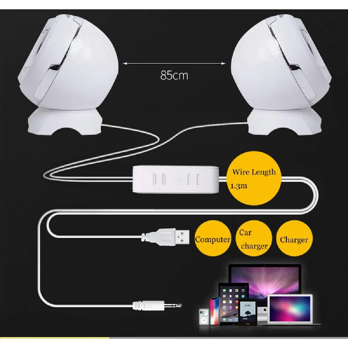 La structure à deux voies et la double corne pour un son stéréo supérieur améliorent la séparation gauche/droite, ce qui rend la voix plus intelligible et la musique plus immersive à courte distance. L'alimentation par USB évite l'adaptateur secteur et permet un câblage simple avec moins d'encombrement sur un bureau chargé. Le boîtier en ABS contribue à une légèreté pratique pour le transport, tout en résistant aux manipulations du quotidien.