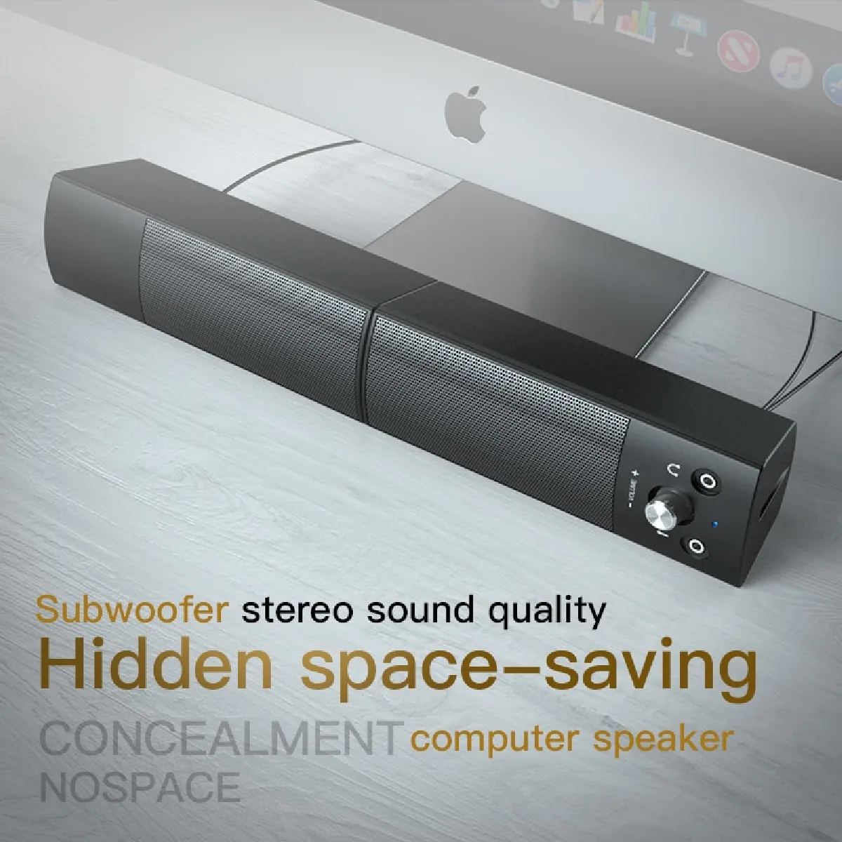 Le design détachable permet deux configurations : soit une barre unique devant l'écran pour une diffusion frontale, soit deux satellites séparés pour une meilleure stéréophonie près du poste de travail. La connexion Bluetooth 5.0 stable assure une lecture fluide avec un appairage rapide aux ordinateurs et appareils compatibles. Le contrôle du volume est directement accessible, ce qui facilite l'ajustement lors d'une visioconférence ou d'une lecture multimédia.