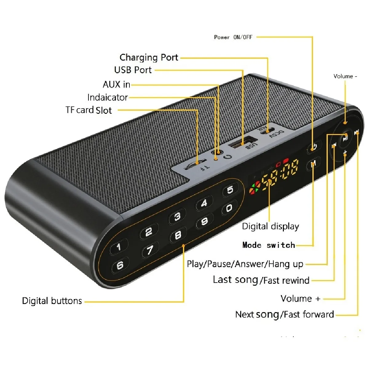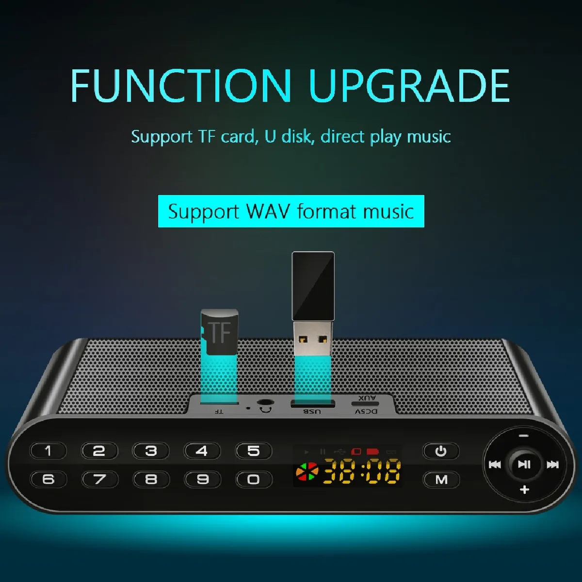 - Lecture depuis carte TF (jusqu'à 32 Go) et USB, formats MP3/WMA/WAV/APE/FLAC