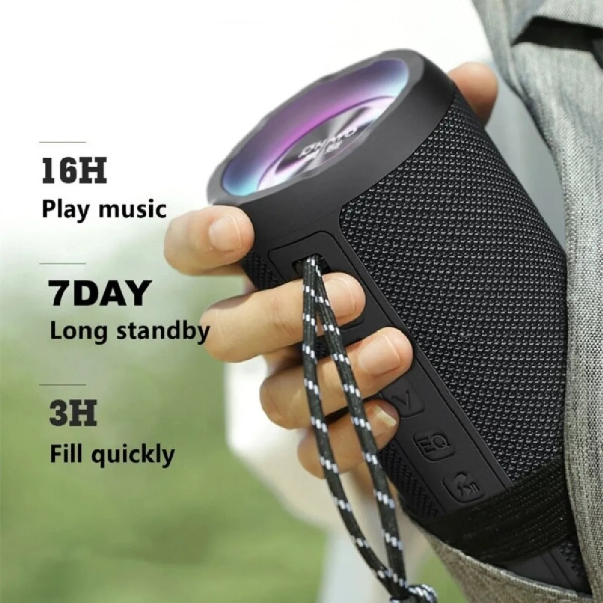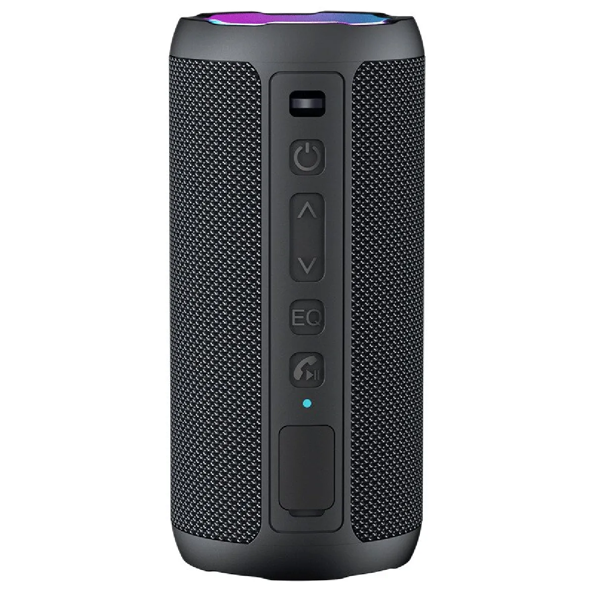 Le format compact facilite l'écoute au quotidien, avec une puissance de 16 W associée à deux hautparleurs de 42 mm pour un volume confortable. Les effets lumineux multicolores synchronisés avec la musique ajoutent une dimension visuelle, utile pour des ambiances en intérieur comme en extérieur. Le boîtier en silicone noir résistant contribue à la durabilité, tandis qu'une connexion Bluetooth 5.0 stable pour le streaming limite les interruptions. La batterie 3600 mAh complétée par une charge USB TypeC soutient de longues sessions d'écoute sans contrainte de prise.