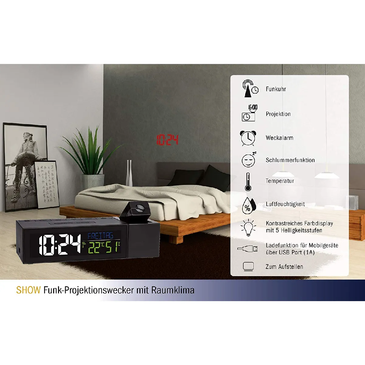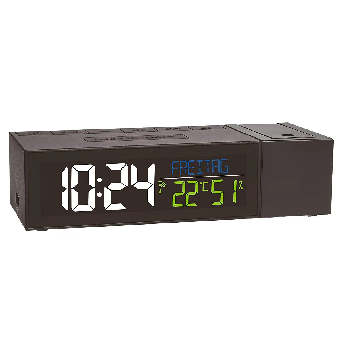 Réveil numérique radiopiloté - Alarme - Date - Température intérieure - Projection date/heure