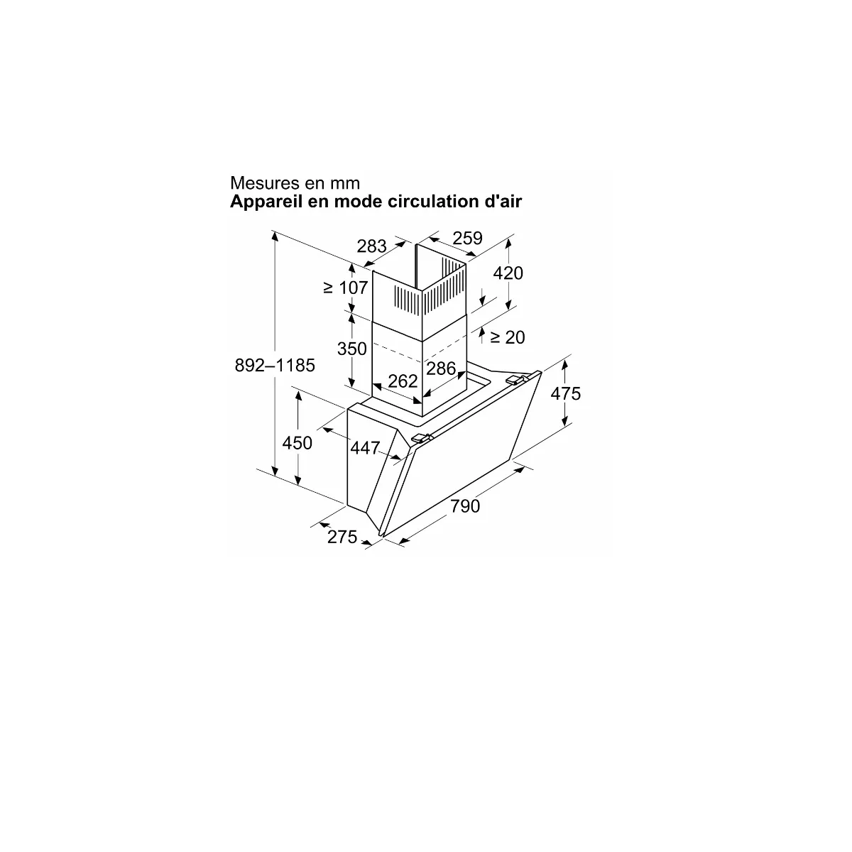 Le format incliné en verre blanc s'intègre dans de nombreux aménagements muraux : largeur 79 cm, profondeur 44,7 cm et hauteur 45 cm. La cheminée réglable facilite l'alignement avec le plafond. Pour l'installation, respecter un écart minimal de 450 mm avec une table électrique et 650 mm avec le gaz. Le mode d'aspiration au choix (recyclage ou évacuation) offre une mise en uvre flexible selon la configuration de la cuisine. Le cordon de 130 cm et les lampes au nombre de 2 complètent une solution fiable pour un usage intensif au quotidien.