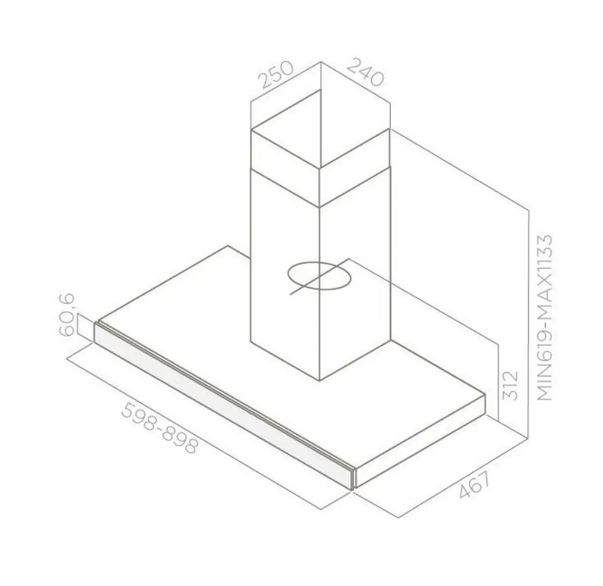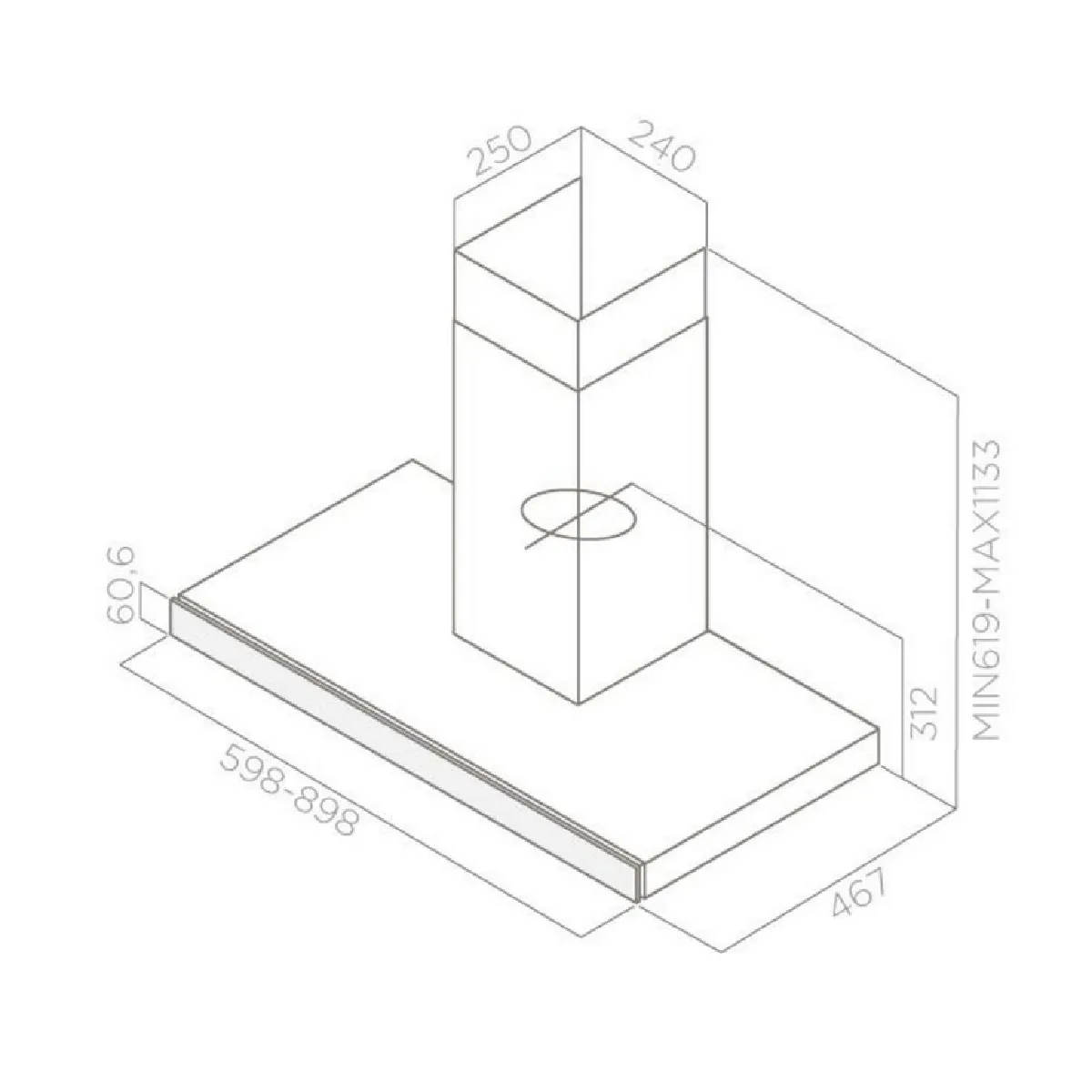 Avec une largeur de 89.8 cm et une profondeur de 46.7 cm, cette hotte décorative s'aligne sur les tables de cuisson de grande taille. La hauteur est ajustable de 61.9 à 113.3 cm pour s'adapter aux différentes hauteurs de plafond et aux préférences d'installation. Le coloris noir avec touches inox et le matériau en verre apportent une finition soignée qui s'intègre dans des cuisines contemporaines. Le poids de 14 kg facilite la manipulation lors de la pose murale en pose libre.