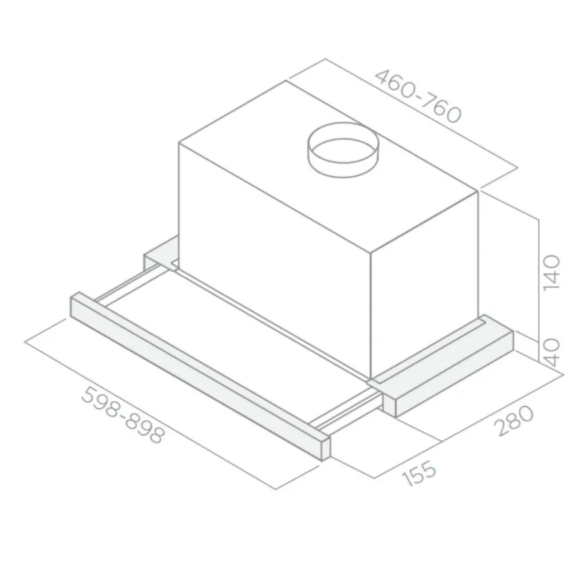 Le format télescopique s'escamote dans un meuble haut pour préserver une ligne de cuisine continue et minimaliste. Avec une largeur de 59.8 cm et une profondeur d'encastrement de 28 cm, l'installation reste compacte tout en couvrant efficacement une table de cuisson standard. Le moteur intégré, associé à 3 vitesses, délivre un débit de 145 à 336 m³/h pour s'adapter aux préparations légères comme aux cuissons plus intenses. En mode recyclage, l'ajout d'un filtre à charbon (non inclus) permet de traiter l'air lorsque l'évacuation n'est pas possible.