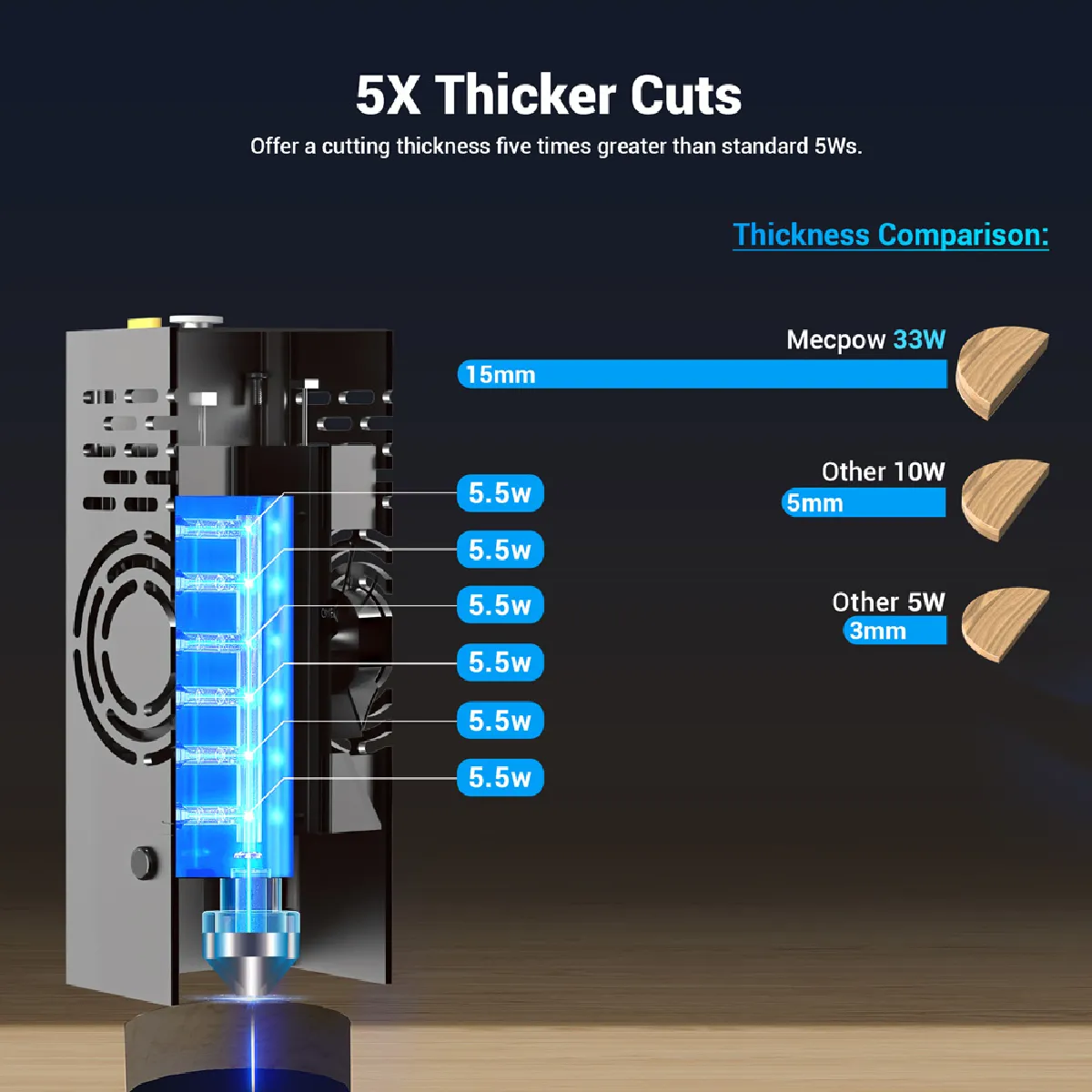 Cette fonctionnalité permet d'ajuster la taille du point lumineux, ce qui permet d'obtenir une pièce plus raffinée. Les grands points lumineux sont préférables pour découper efficacement des objets plus épais, tandis que les petits points lumineux sont préférables pour graver et découper des objets plus fins.Vitesse incroyable de 25 000 mm/min