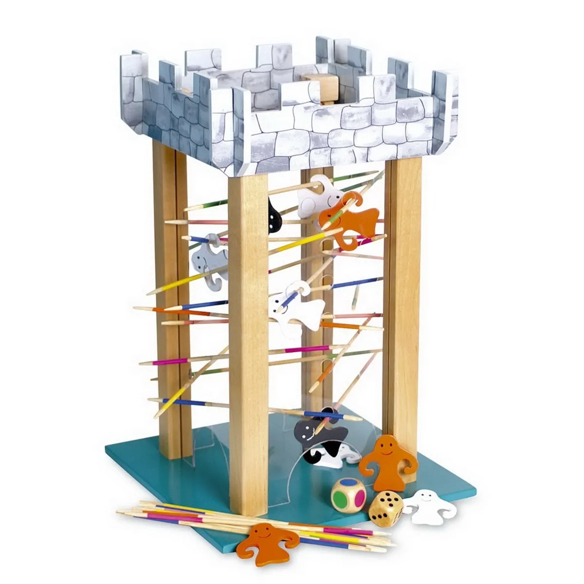 Un jeu dadresse pour les mains et les yeux. Qui peut retirer une ou plusieurs tiges de la tour sans faire tomber les fantômes? Eveil de la concentration et de la motricité! Un jouet en bois de la marque Legler réf : 7656