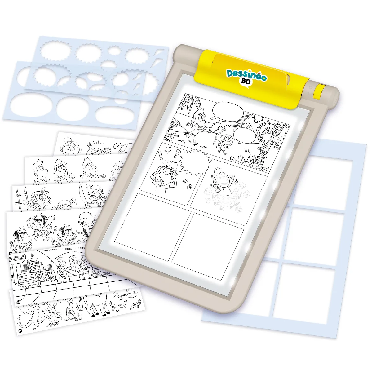 L'outil central est une tablette lumineuse qui met en valeur les contours pour un repérage immédiat des formes. La lumière souligne chaque étape et aide à positionner personnages, bulles et décors sans effort. L'enfant apprend à composer une planche en respectant l'ordre de lecture, ce qui facilite la compréhension du rythme et des transitions. Cette approche méthodique encourage des gestes stables et des lignes nettes, utiles pour reproduire des expressions et créer des mouvements simples.