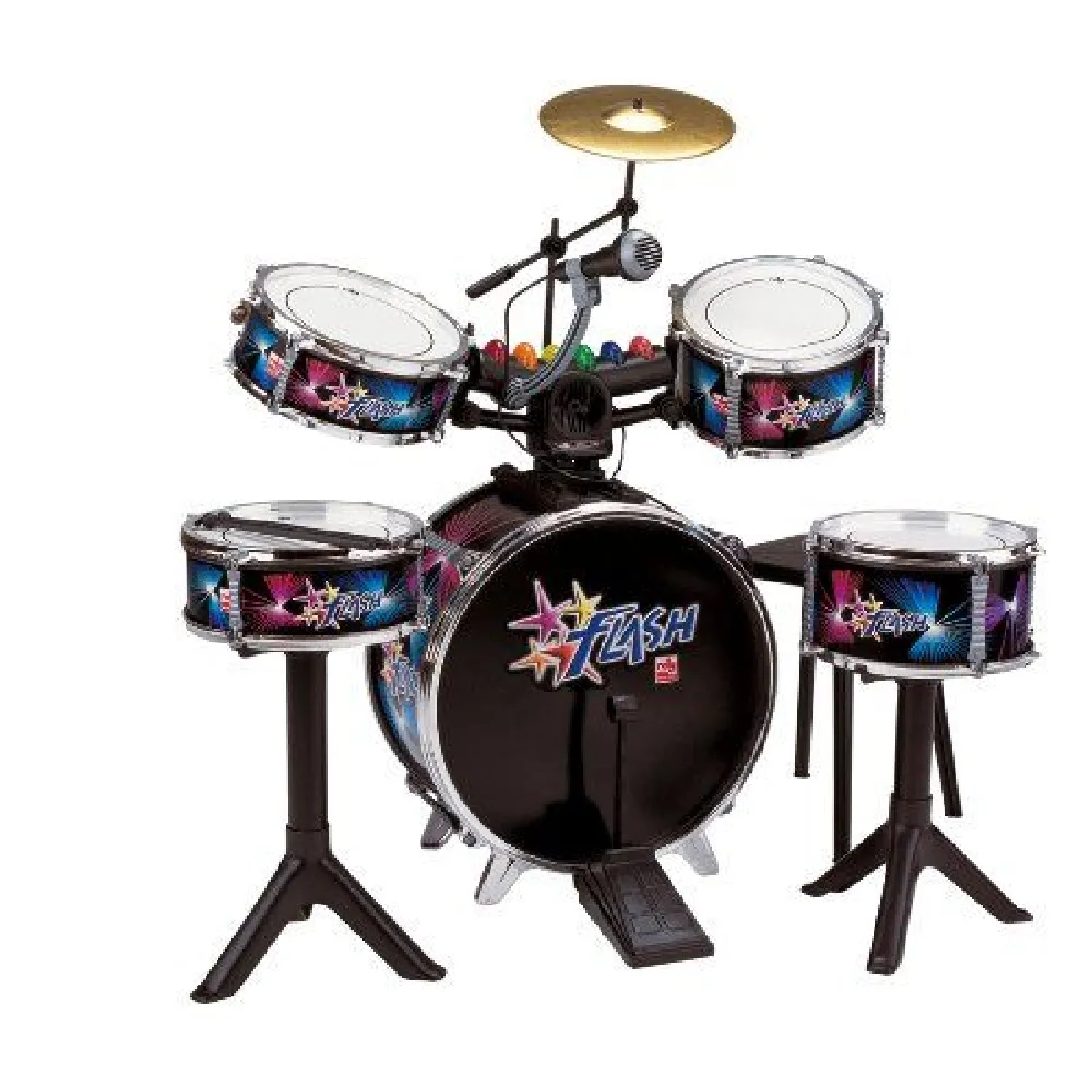 Descriptif produit: Grosse caisse, 2 tambours inclinables, cymbale, microphone, effets lumières 5 rythmes de batterie, pédale de grosse caisse, baguettes, tabouret, cercles de tambours métallisés, caisse claire et tom avec pieds individuels.