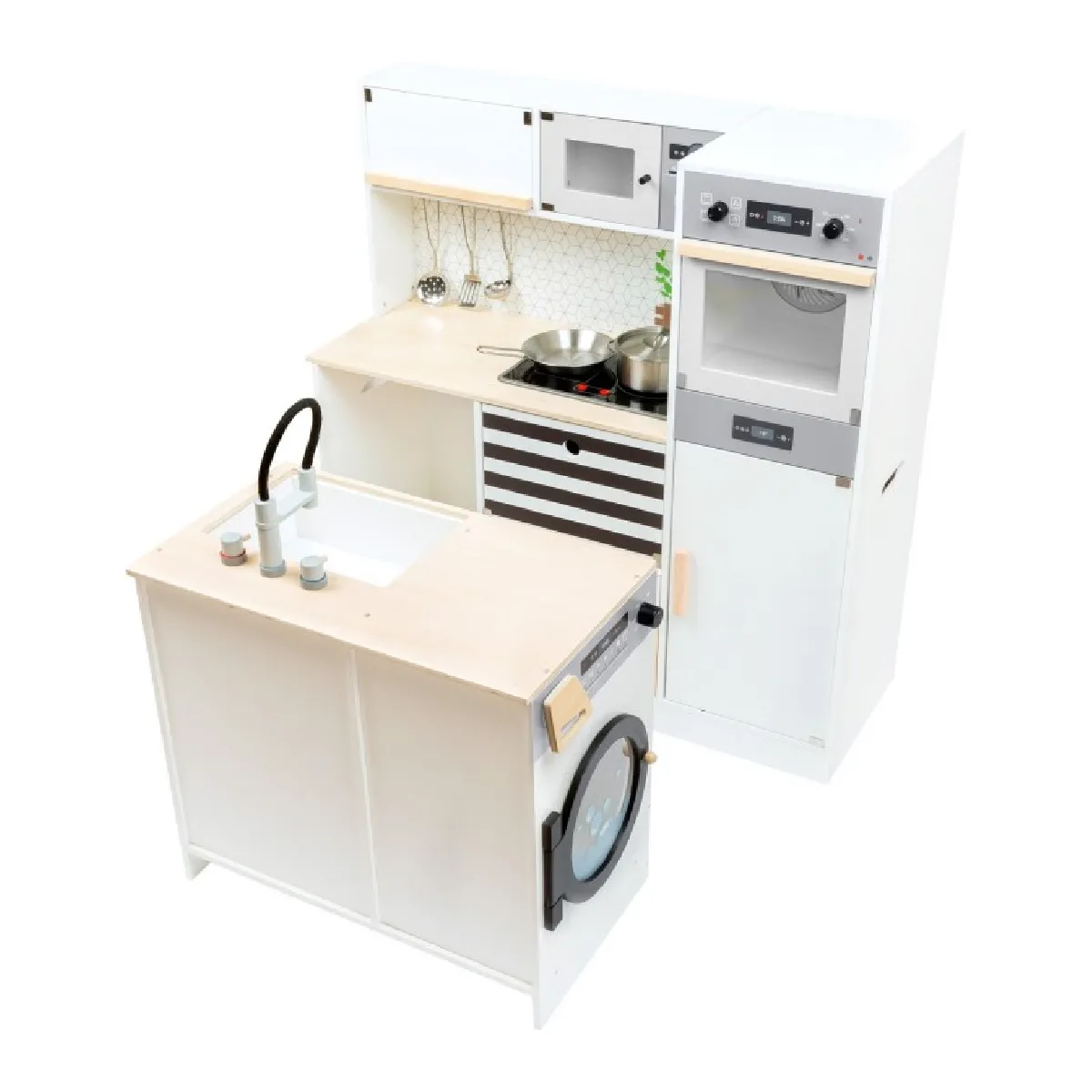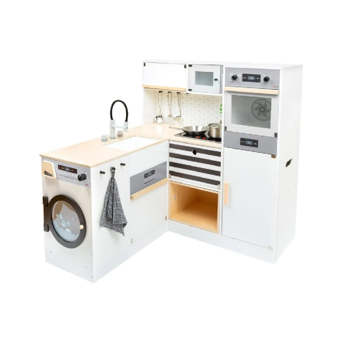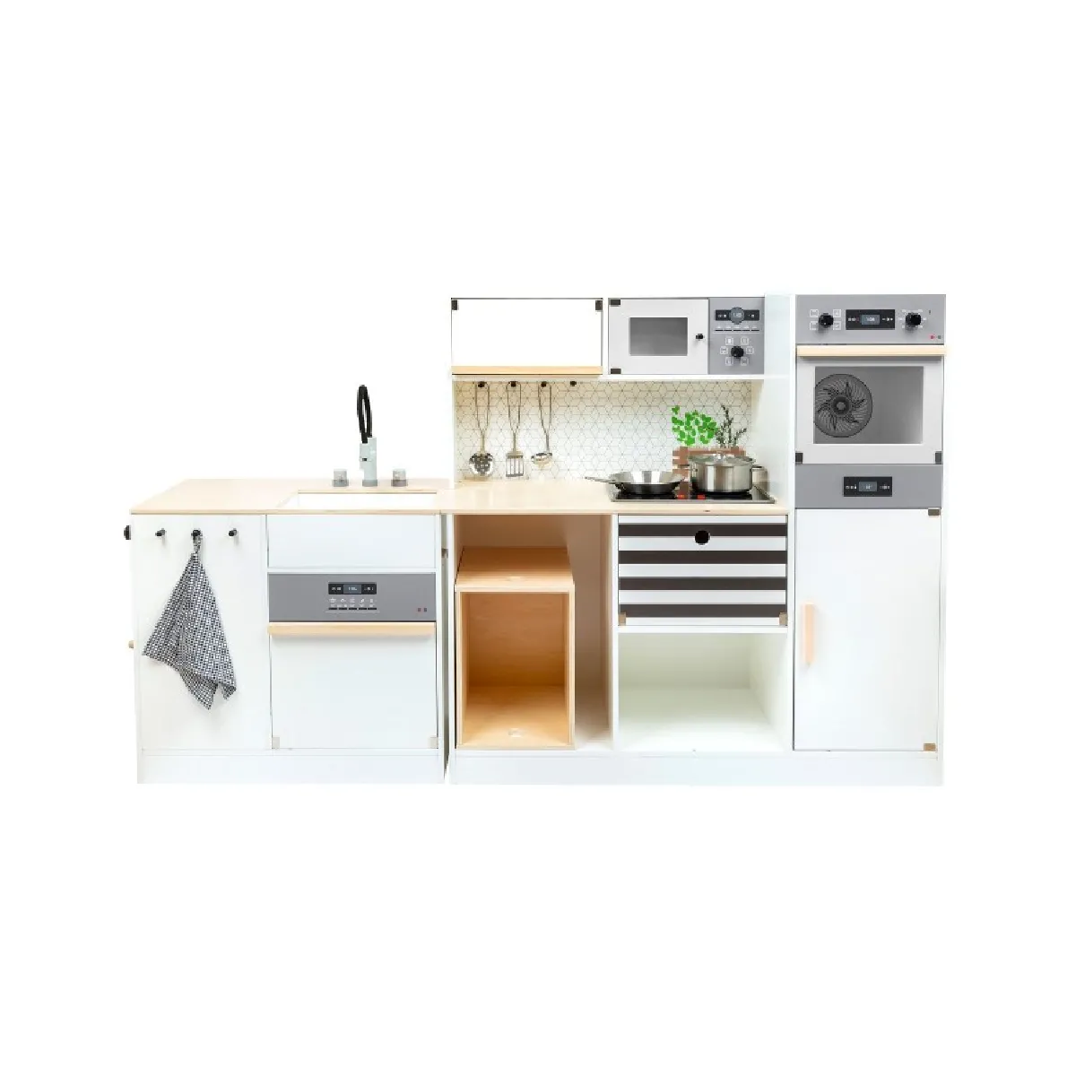 Avis aux chefs cuisiniers! Cette grande cuisine pour enfants équipée d´une cuisinière, d´un évier, d´un lave-vaisselle, d´un micro-ondes, d´un réfrigérateur et d´un four, dispose de tous les électroménagers d´une maison moderne. Grâce à son système modulaire, il peut être utilisé comme coin cuisine, kitchenette ou cuisine avec îlot de travail et offre de l´espace pour plusieurs enfants pour des jeux de rôle créatifs. Les boutons rotatifs avec bruit de clic et la plaque de cuisson éclairée avec bruit de cuisson assurent un plaisir de jeu réaliste. Ustensiles de cuisine en métal inclus. Piles non incluses. La cuisine de jeu a des boîtes de rangement amovibles. Grâce à sa forme linéaire et à la forte proportion de bois visible, la cuisine pour enfants présente dans un aspect noir et blanc moderne. Cuisine modulableAprès le jeu, on regroupe les éléments pour gagner de la place. Un vrai classique du jeu de rôle dans un design nordique moderne et simple !Dimensions : env. 83 x 29 x 83 cm Hauteur plan de travail 48 cmHauteur : 83 cmMatériel : tissu, plastique et boisPoids : 26,3 kgCaractéristiques particulières : Articles aimantés