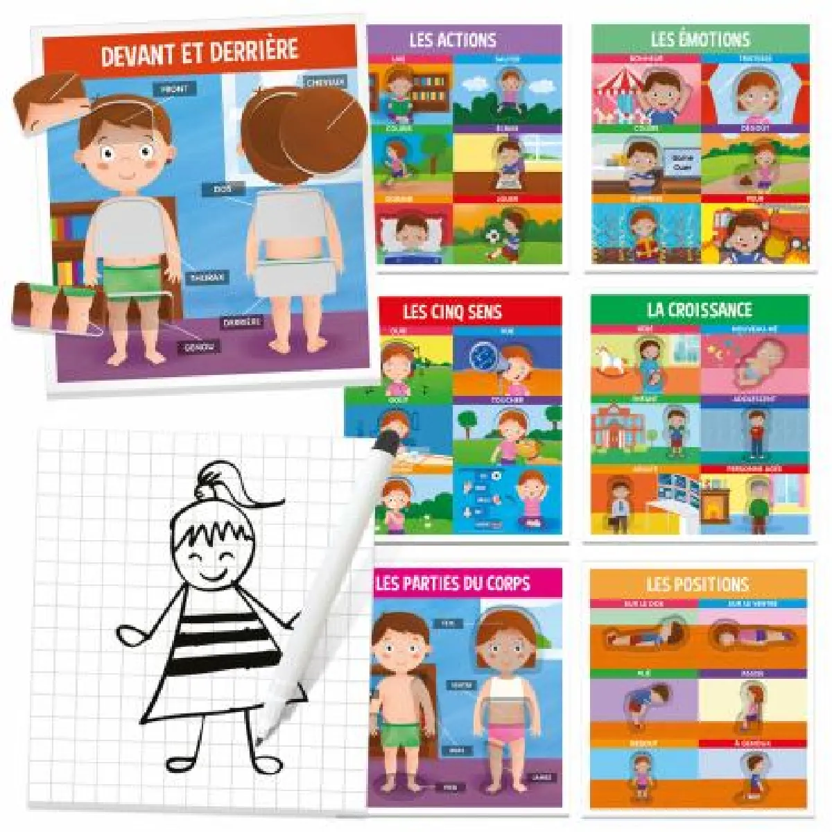 Un jeu à encastrements amusant pour apprendre à reconnaître sa propre identité physique et émotionnelle. L'enfant découvre les parties et les positions du corps, les cinq sens, les expressions du visage et bien d'autres choses encore. Il apprend également à représenter le corps en le dessinant.