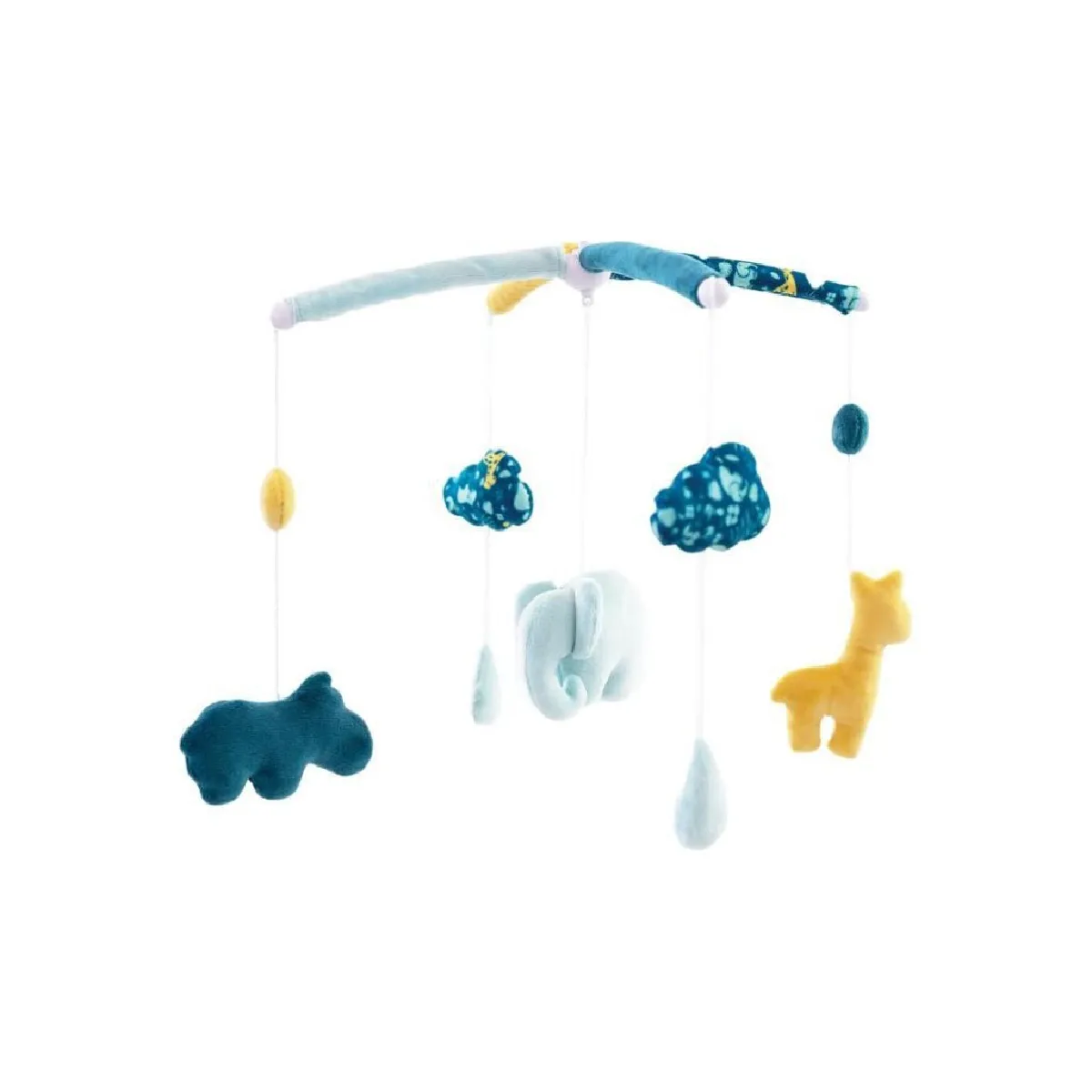 Le mobile musical Za Ni Mo bercera bébé pour l'emporter dans des reves merveilleux - Sujets détachable et lavable. Arche PVC Blanc avec fixation a molette - Boîte a musique équipée d'un bouton marche/arret - Conforme a la norme NF EN 71 1-2-3 - Sujets : e