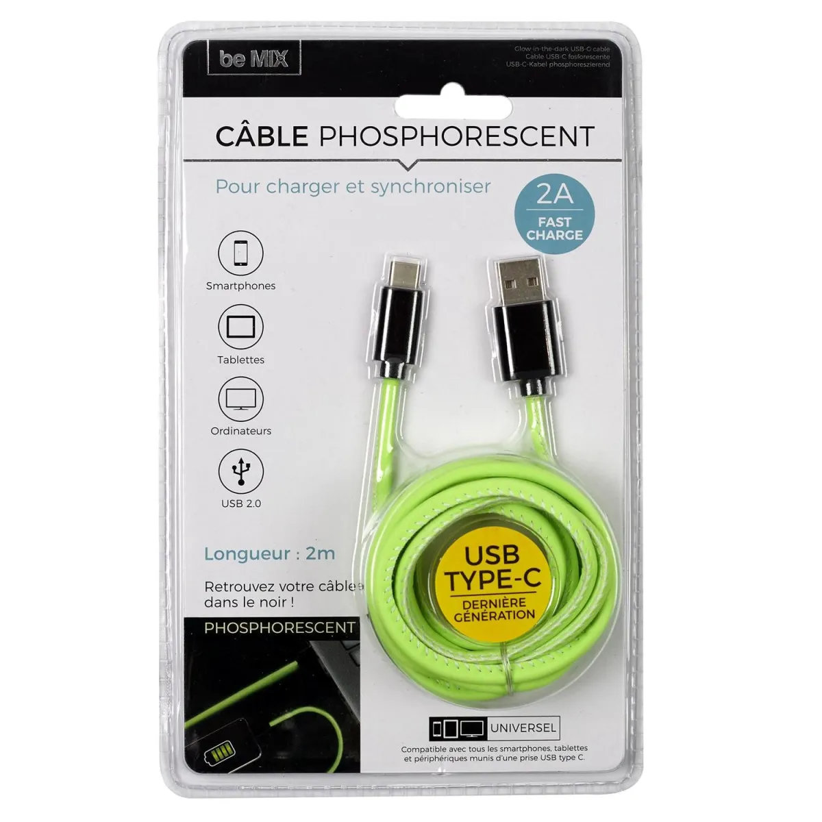 Câble de charge - USB Type C - Phosphorescent - Fast Charge 2A - 200cm de longueur