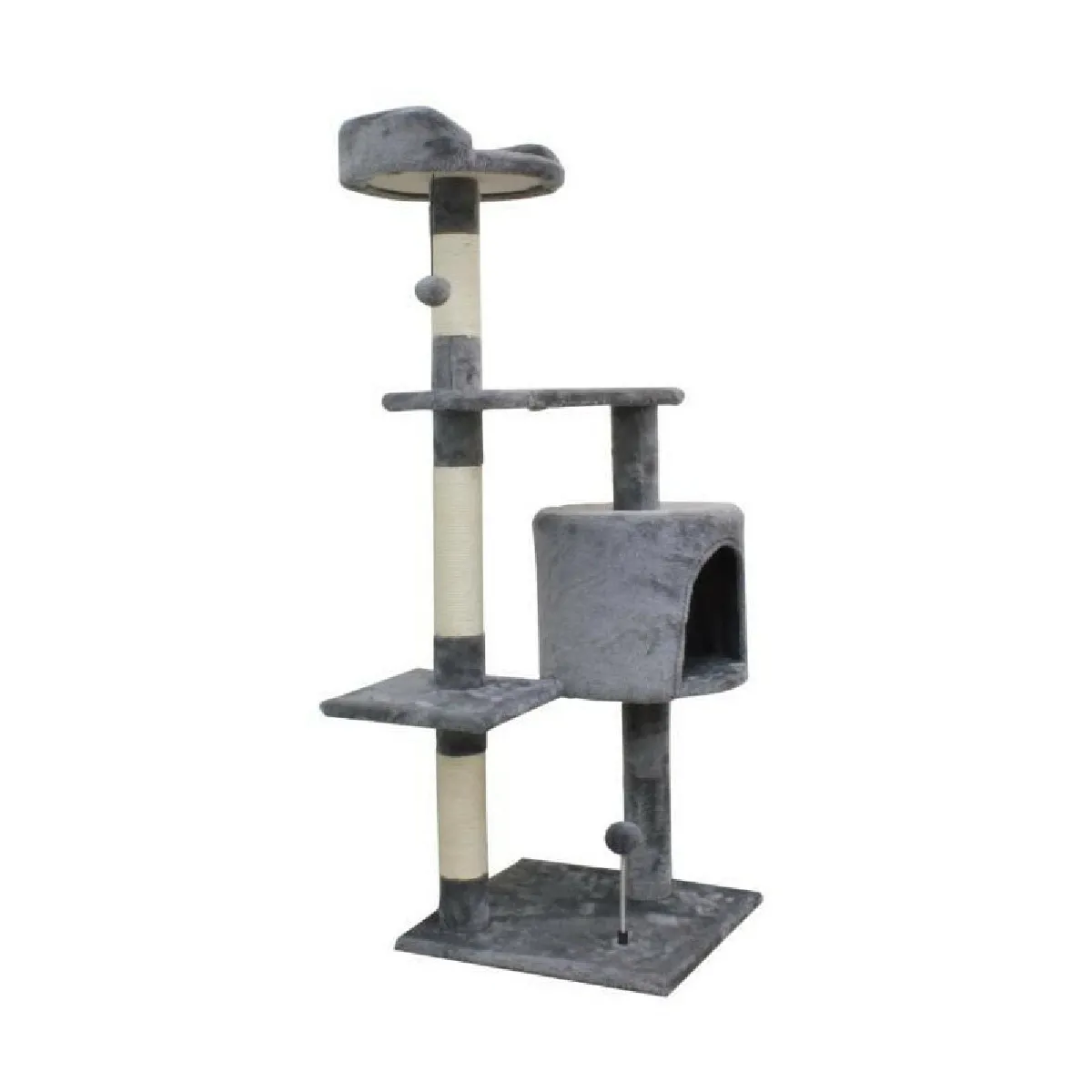 Moyen arbre a chat JASPER avec niche et balles de jeu - ALC06 - Gris - Dimensions : 40 x 40 x 114 cm - Structure : 3 plateformes, 2 balles de jeu, 1 niche et poteaux a griffer - Composition : Poteau en sisal de dia. 7 cm avec tissu en peluche court, 180gsm avec panneaux de fond 40 x 40cm boîte souple dia. 30cm H25cm, plate-forme supérieure : 30 x 10cm, 2eme plate-forme : dia. 40 cm, 3eme plate-forme: 30 x 30cm