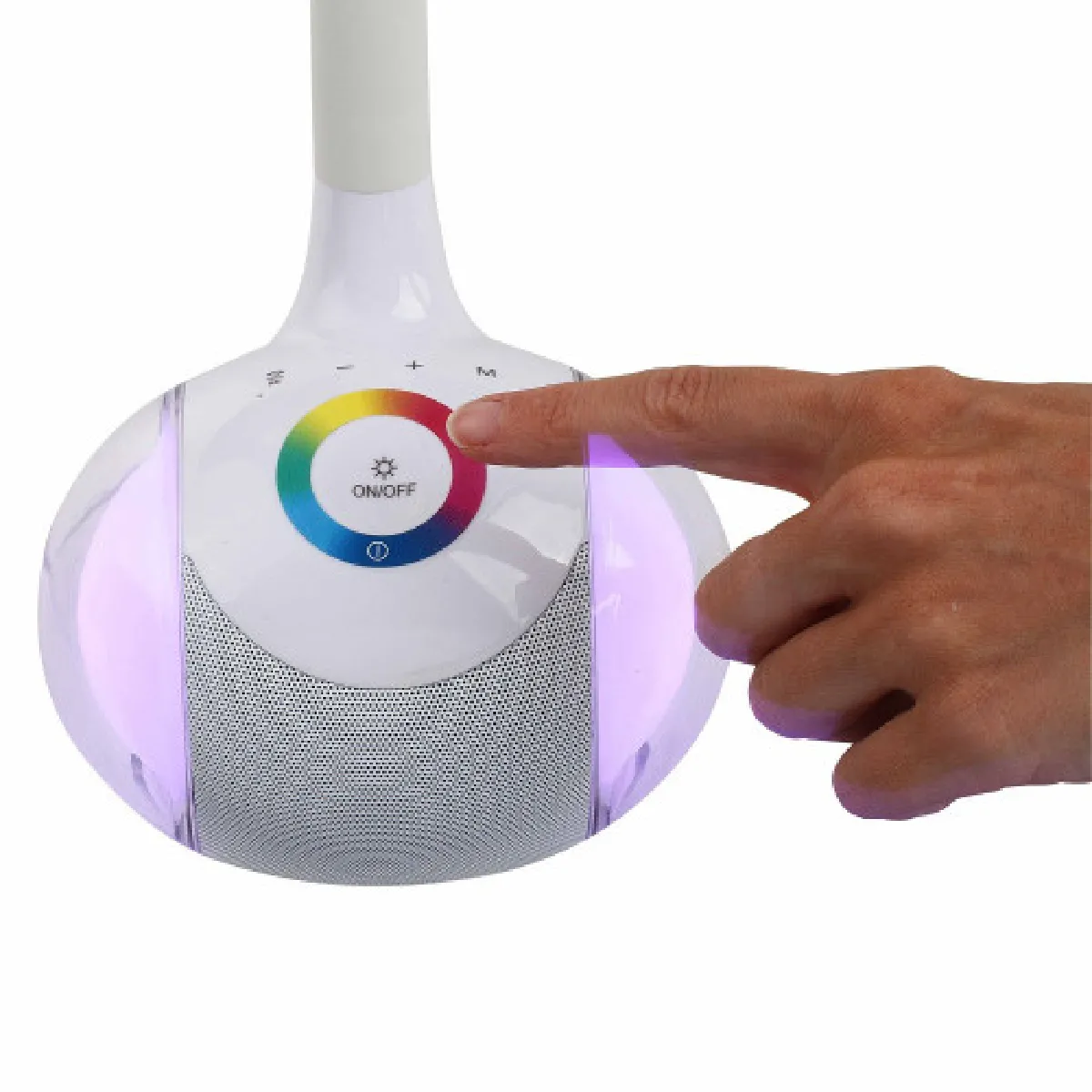 Commentaire vendeur : PING vous propose : Une lampe LED avec haut-parleur d'une puissance de 5W. Elle est compatible Bluetooth® (portée jusqu'à 10 mètres) et a un microphone intégré, ce qui permet de répondre aux appels téléphoniques en mains libres. Vous pouvez brancher via le port USB une source de musique compatible avec le format MP3 et ainsi profiter de vos morceaux préférés sur cette lampe LED. Ce port permet aussi de recharger tous types d'appareils USB. Avec le contrôle tactile, vous pouvez régler l'éclairage en 3 intensités différentes et de différentes couleurs changeantes. Le bras en silicone est flexible, ce qui permet de régler la lampe à votre guise. Les plus-produits : - Eclairage doux, moyen et soutenu - Contrôle tactile - Microphone intégré Caractéristiques générales : - Haut-parleur 1 x 5 watts (ø 52mm)- Bluetooth V4.2- Microphone intégré (fonction mains-libres)- LEDs multicolores avec variateur de couleurs 3 niveaux de luminosité par bouton tactile : fort, normal, doux- Température couleur : 5500~6500k- RGB 256 couleurs / Lumen max.: 300 Lumens- Lumière douce pour les yeux- Touches tac